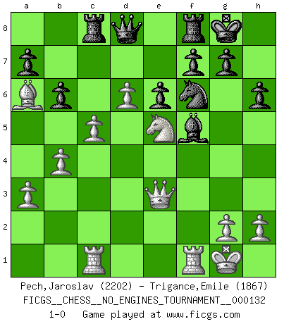 Last move : 1-0 2024 September 29 5:59:16 [Event "FICGS__CHESS__NO_ENGINES_TOURNAMENT__000132"] [Site "FICGS"] [Date "2024.03.15"] [Round "1"] [White "Pech,Jaroslav"] [Black "Trigance,Emile"] [Result "1-0"] [WhiteElo "2202"] [BlackElo "1867"] 1.e4 Nf6 2.e5 Nd5 3.d4 d6 4.c4 Nb6 5.f4 dxe5 6.fxe5 Nc6 7.Be3 Bf5 8.Nc3 e6 9.Nf3 Be7 10.Be2 O-O 11.O-O h6 12.d5 Nb8 13.Qd2 N8d7 14.d6 cxd6 15.exd6 Bf6 16.c5 Bxc3 17.Qxc3 Nd5 18.Qd2 Nxe3 19.Qxe3 Rc8 20.Rac1 Qa5 21.a3 Nf6 22.Ne5 Qd8 23.b4 b6 24.Ba6 1-0 Follow this game move after move (download)Man is a frivolous, a specious creature, and like a Chess player, cares more for the process of attaining his goal than for the goal itself. (Dostoyevsky) Kritik überlasse ich den Spießern. Ich zeige nichts, wofür ich mich schämen muss. (Alexandra Kosteniuk) El Ajedrez es una manera fabulosa para que los niños aprendan a autovalorarse y a autoestimarse. (Saudin Robovic) Je crois qu'il existe des manières très spécifiques de jouer efficacement contre une machine. Evidemment, nous n'avons aucune chance en technique pure, parce que l'ordinateur calcule de manière parfaite. Mais lorsque nous faisons appel à notre cerveau, en utilisant l'intuition et la compréhension, alors nous restons beaucoup plus forts. (Anatoli Karpov) Success without honor is an unseasoned dish; it will satisfy your hunger, but it won't taste good. (Joe Paterno)