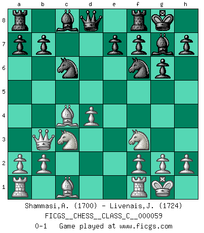 Last move : 0-1 2007 November 4 18:33:52 [Event "FICGS__CHESS__CLASS_C__000059"] [Site "FICGS"] [Date "2007.09.14"] [Round "1"] [White "Shammasi,Amir"] [Black "Livenais,Jean-Rene"] [Result "0-1"] [WhiteElo "1700"] [BlackElo "1724"] 1.c4 c5 2.Nc3 g6 3.Nf3 Bg7 4.e3 Nf6 5.d4 cxd4 6.exd4 d5 7.Qb3 dxc4 8.Bxc4 O-O 9.O-O Nc6 0-1 This chess game has been lost on time (started : 2007.09.14 14:30:58) English : Symmetrical variation Kingside Castling by player Black (move 8) Kingside Castling by player White (move 9) Player Black won this chess game. Follow this game move after move (download)A great player and a great example for many. His book My 60 Memorable Games had a big impact on me. It is a shame he didn't continue to enrich the world of chess with his unparalleled understanding after 1972. (Jan Timman, about Bobby Fischer's death) Ich bin es gewohnt, das die Jugend mir überhaupt keinen Respekt entgegenbringt. (Alexander Morozewich) EL Ajedrez es como la vida. (Boris Spassky) Les échecs, c'est la lutte contre l'erreur. (Johannes Zukertort) Life is like a ten-speed bicycle: most of us have gears we never use. (Charles M. Schulz)