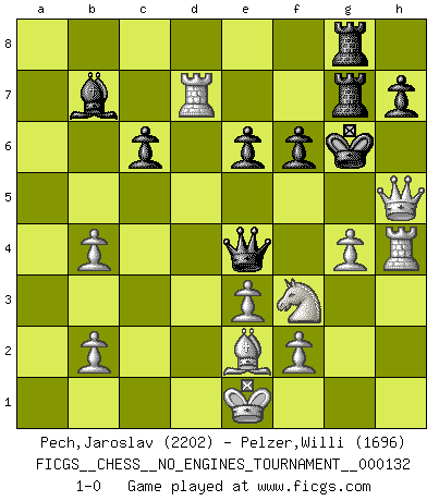 Last move : 1-0 2024 August 17 15:45:4 [Event "FICGS__CHESS__NO_ENGINES_TOURNAMENT__000132"] [Site "FICGS"] [Date "2024.03.15"] [Round "1"] [White "Pech,Jaroslav"] [Black "Pelzer,Willi"] [Result "1-0"] [WhiteElo "2202"] [BlackElo "1696"] 1.d4 Nc6 2.c4 d5 3.Nc3 Nf6 4.Nf3 e6 5.a3 a5 6.Bg5 Be7 7.Bf4 Nh5 8.Be5 Nxe5 9.dxe5 dxc4 10.Qc1 g5 11.e3 c6 12.g4 Ng7 13.h4 gxh4 14.Bxc4 b5 15.Be2 Bb7 16.Ne4 Qd5 17.Nf6+ Bxf6 18.exf6 Rg8 19.fxg7 Rxg7 20.Rxh4 Ke7 21.Qc3 Rag8 22.Rd1 b4 23.axb4 Qe4 24.Qc5+ Ke8 25.Qxa5 f6 26.Rd8+ Kf7 27.Rd7+ Kg6 28.Qh5+ 1-0 Follow this game move after move (download)The most powerful weapon in Chess is to have the next move. (David Bronstein) Das Zentrum ist der Balkan des Schachbretts - Kriegshandlungen können in jedem Moment ausbrechen. (Aaron Nimzowitsch) Debes de llevar a tu oponente hacia un profundo y obscuro bosque donde 2+2=5, y el camino que conduce a la salida es suficientemente ancho para solamente uno. (Mikhail Tal) Il s'avisa de me proposer d'apprendre les échecs qu'il jouait un peu... me voilà forcené des échecs. J'achète un échiquier, je m'enferme dans ma chambre, j'y passe des jours et des nuits à vouloir apprendre par cur toutes les parties. (Jean-Jacques Rousseau, Confessions) It's not the size of the dog in the fight, it's the size of the fight in the dog. (Mark Twain)