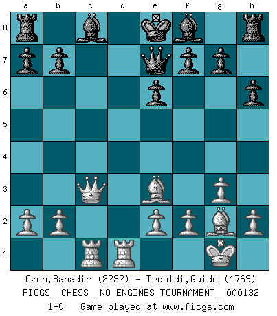 Last move : 1-0 2024 May 28 8:57:44 [Event "FICGS__CHESS__NO_ENGINES_TOURNAMENT__000132"] [Site "FICGS"] [Date "2024.03.15"] [Round "1"] [White "Ozen,Bahadir"] [Black "Tedoldi,Guido"] [Result "1-0"] [WhiteElo "2232"] [BlackElo "1769"] 1.g3 c5 2.Bg2 d5 3.Nf3 Nc6 4.d4 e6 5.O-O h6 6.c4 Nf6 7.cxd5 Nxd5 8.Nc3 cxd4 9.Nxd4 Nxd4 10.Qxd4 Nxc3 11.Qxc3 Qb6 12.Be3 Qd6 13.Rfd1 Qe7 14.Rac1 1-0 Follow this game move after move (download)Chess is mental torture. (Garry Kasparov) Ohne Leiden bildet sich kein Charakter. (Ernst Freiherr von Feuchtersleben) La batalla por la última verdad nunca sera ganada. Y es por eso que el Ajedrez es tan fascinante. (Hans Kmoch) Aux échecs, les retours au sommet sont rares : les dommages psychologiques consécutifs à une défaite sont trop sévères. (Daily Telegraph) Memory is a complicated thing, a relative to truth, but not its twin. (Barbara Kingsolver, Animal Dreams)