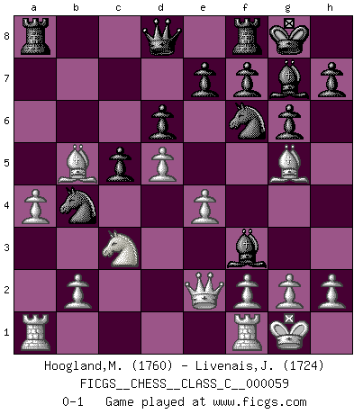 Last move : 0-1 2007 December 28 22:2:2 [Event "FICGS__CHESS__CLASS_C__000059"] [Site "FICGS"] [Date "2007.09.14"] [Round "1"] [White "Hoogland,Mike"] [Black "Livenais,Jean-Rene"] [Result "0-1"] [WhiteElo "1760"] [BlackElo "1724"] 1.d4 Nf6 2.c4 c5 3.d5 b5 4.Nf3 g6 5.Qc2 Bg7 6.e4 d6 7.cxb5 a6 8.Nc3 O-O 9.a4 axb5 10.Bxb5 Na6 11.O-O Nb4 12.Qe2 Bg4 13.Bg5 Bxf3 0-1 This chess game has been lost on time (started : 2007.09.14 14:30:58) Benko gambit Kingside Castling by player Black (move 8) Kingside Castling by player White (move 11) Player Black won this chess game. Follow this game move after move (download)It is difficult to play against Einstein's theory --on his first loss to Fischer. (Mikhail Tal) Die FIDE ist dabei in die Hände der russischen Mafia zu fallen. (Larry Evans) Los asuntos humanos son como una partida de Ajedrez: solo aquellos que no lo toman seriamente, pueden ser llamados buenos jugadores. (Hung Tzu Ch'eng) Les Echecs, c'est l'art de la guerre sans les charniers, c'est la résurrection des morts tombés au champ d'honneur, l'espoir perpétuel, la suprématie de l'intelligence sur la force, la culture de l'esprit. (F. Szpiner) The human is the only animal species whose members are able to talk themselves into difficulties that would not otherwise exist. (Wendell Johnson)