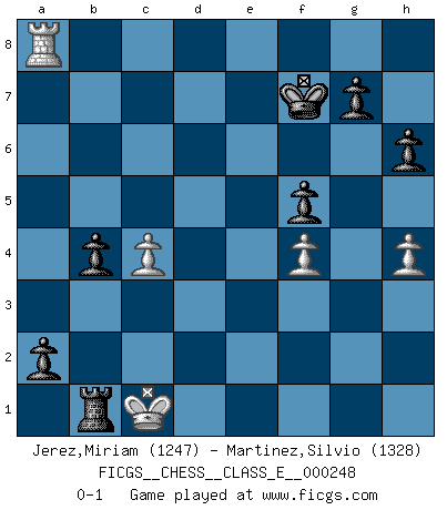 Last move : 0-1 2024 July 13 22:12:37 [Event "FICGS__CHESS__CLASS_E__000248"] [Site "FICGS"] [Date "2024.03.16"] [Round "1"] [White "Jerez,Miriam"] [Black "Martinez,Silvio"] [Result "0-1"] [WhiteElo "1247"] [BlackElo "1328"] 1.e4 e5 2.Nf3 Nc6 3.Nc3 Nf6 4.Bb5 a6 5.Bxc6 dxc6 6.O-O c5 7.d3 Be7 8.Nxe5 O-O 9.h3 b5 10.Bg5 Be6 11.Re1 h6 12.Bxf6 Bxf6 13.Nc6 Qd6 14.e5 Bxe5 15.Nxe5 Rfe8 16.b3 b4 17.Ne4 Qb6 18.Qf3 Bd5 19.Qf4 f6 20.Ng6 Qc6 21.c4 Bxe4 22.Rxe4 Rxe4 23.dxe4 Re8 24.Rd1 Rxe4 25.Qf3 Kf7 26.Nh8+ Kg8 27.Rd8+ Kh7 28.Nf7 Re1+ 29.Kh2 Qxf3 30.gxf3 Re2 31.Rh8+ Kg6 32.Kg3 Kxf7 33.f4 Rxa2 34.Kg4 Rxf2 35.Rd8 Rb2 36.Rd7+ Kg6 37.h4 f5+ 38.Kf3 Rxb3+ 39.Ke2 c6 40.Rd6+ Kf7 41.Rxc6 a5 42.Rxc5 a4 43.Kd2 a3 44.Rc8 a2 45.Ra8 Rb2+ 46.Kc1 Rb1+ 0-1 Follow this game move after move (download)All that matters on the Chessboard is good moves. (Bobby Fischer) Schach ist das schnellste Spiel der Welt, weil man in jeder Sekunde Tausende von Gedanken ordnen muß. (Albert Einstein) Un jugador que trata de regresar una movida en el Ajedrez es un futuro carterista. (Richard Fenton) Il n'y a pas eu de défaite parce que je ne crois pas que cet ordinateur ait jamais existé. IBM a triché en refusant d'imprimer les modes de recherche de la machine. C'est évident, pendant le match, des coups décisifs ont été joués par des êtres humains. Aujourd'hui, les meilleurs spécialistes en informatique ne peuvent toujours pas expliquer comment Deep-Blue a pu jouer contre la logique des ordinateurs. IBM a gagné une guerre de communication, mais ils sont incapables de prouver que l'ordinateur a gagné tout seul. (Garry Kasparov) They say poker is a zero-sum game. It must be, because every time I play my sum ends up zero. (Max Shapiro)