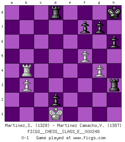Last move : 0-1 2025 January 4 2:26:4 [Event "FICGS__CHESS__CLASS_E__000248"] [Site "FICGS"] [Date "2024.03.16"] [Round "1"] [White "Martinez,Silvio"] [Black "Martinez Camacho,Victor Hugo"] [Result "0-1"] [WhiteElo "1328"] [BlackElo "1387"] 1.e4 e5 2.Nf3 Nc6 3.Nc3 Nf6 4.d4 exd4 5.Nxd4 Bc5 6.Nf5 O-O 7.Be3 Bxe3 8.fxe3 d6 9.Bc4 Bxf5 10.exf5 Ne5 11.Bb3 c6 12.h3 Qd7 13.Qd2 Rad8 14.O-O-O Kh8 15.e4 d5 16.g4 h6 17.a3 Qc7 18.Kb1 Nxe4 19.Qe3 Rfe8 20.Nxd5 cxd5 21.Ba4 Re7 22.Bb3 Red7 23.Rhe1 Nc4 24.Bxc4 Qxc4 25.Qxa7 b5 26.Qe3 b4 27.b3 Nc3+ 28.Kc1 Qa6 29.Qd3 Qxa3+ 30.Kd2 Qa7 31.Ra1 Qf2+ 32.Re2 Nxe2 33.Qxe2 Qxe2+ 34.Kxe2 d4 35.Kd3 Rc7 36.Rc1 Rc3+ 37.Kd2 d3 38.Ra1 Rxc2+ 39.Kd1 Rh2 40.Ra4 Rxh3 41.Rxb4 d2 0-1 Follow this game move after move (download)Play the opening like a book, the middle game like a magician, and the endgame like a machine. (Spielmann) Die Partien sind immer verschieden, die Interviews immer die gleichen. (Garry Kasparov) No hay precio que sea tan grande por la cabellera del Rey enemigo. (Koblentz) Mon pion favori sur ma case favorite ! Bronstein en parlant d'un coup de pion en h5 quand il avait les Noirs. The Internet isn't free. It just has an economy that makes no sense to capitalism. (Brad Shapcott)
