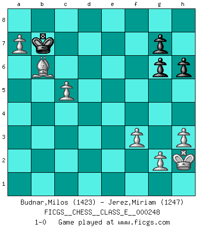 Last move : 1-0 2024 August 5 18:58:42 [Event "FICGS__CHESS__CLASS_E__000248"] [Site "FICGS"] [Date "2024.03.16"] [Round "1"] [White "Budnar,Milos"] [Black "Jerez,Miriam"] [Result "1-0"] [WhiteElo "1423"] [BlackElo "1247"] 1.e4 e5 2.Nf3 Nc6 3.Bb5 a6 4.Ba4 Nf6 5.d3 d5 6.h3 dxe4 7.Bxc6+ bxc6 8.Nxe5 Bb7 9.O-O Bd6 10.Bf4 O-O 11.Bh2 c5 12.Nc3 Bxe5 13.Bxe5 exd3 14.Qxd3 Re8 15.Qxd8 Raxd8 16.Bxc7 Rc8 17.Bg3 h6 18.a4 a5 19.Nb5 Rcd8 20.Rae1 Rxe1 21.Rxe1 Ba6 22.Nc3 Rd2 23.Rc1 Bb7 24.Bc7 Nd5 25.Nxd5 Bxd5 26.Bxa5 Re2 27.f3 Kf8 28.c4 Bc6 29.b3 Ke7 30.Rb1 Re6 31.Bb6 Re5 32.a5 Rg5 33.Kh2 Bb7 34.b4 cxb4 35.Rxb4 Kd7 36.Be3 Rg6 37.Rxb7+ Kc6 38.Rb6+ Kc7 39.Rxg6 fxg6 40.a6 Kb8 41.a7 Ka8 42.Bb6 Kb7 43.c5 1-0 Follow this game move after move (download)Alekhine is a poet who creates a work of art out of something that would hardly inspire another man to send home a picture post card. (Max Euwe) Bobby Fischer ist kein Vorbild für die heutige Jugend. (Viktor Kortschnoi) El Ajedrez, como la música, como el amor, tiene el poder de hacer feliz a la gente. (Siegbert Tarrasch) Les pièces de l'échiquier étaient impitoyables. Elles le retenaient, elles l'absorbaient. Il y avait de l'horreur en cela, mais aussi une harmonie unique. Car, qu'y a-t-il dans le monde, à part les échecs ? (V. Nabokov) The ultimate in disposing one's troops is to be without ascertainable shape. Then the most penetrating spies cannot pry in nor can the wise lay plans against you. (Sun Tzu)