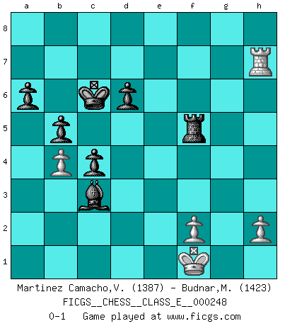 Last move : 0-1 2024 September 6 0:56:54 [Event "FICGS__CHESS__CLASS_E__000248"] [Site "FICGS"] [Date "2024.03.16"] [Round "1"] [White "Martinez Camacho,Victor Hugo"] [Black "Budnar,Milos"] [Result "0-1"] [WhiteElo "1387"] [BlackElo "1423"] 1.e4 e5 2.Nf3 d6 3.d4 exd4 4.Nxd4 h6 5.Bc4 c5 6.Nb3 Be6 7.Bb5+ Nc6 8.O-O Qb6 9.Bxc6+ Qxc6 10.Nc3 Bxb3 11.axb3 O-O-O 12.Qg4+ Kb8 13.Nd5 g6 14.Bd2 h5 15.Qe2 a6 16.Ra2 Ne7 17.Nxe7 Bxe7 18.Bc3 Rhe8 19.Re1 Bg5 20.b4 c4 21.Qf3 f5 22.exf5 Qxf3 23.gxf3 Rxe1 24.Kg2 Re2 25.fxg6 Rxc2 26.g7 Rg8 27.Ra5 Rxc3 28.bxc3 Rxg7 29.Kf1 h4 30.Rd5 Kc7 31.Rd4 b5 32.f4 Bf6 33.Re4 Bxc3 34.f5 Rf7 35.Rxh4 Rxf5 36.Rh7+ Kc6 0-1 This chess game has been lost on time (started : 2024.03.16 15:41:42) Follow this game move after move (download)Chess is no whit inferior to the violin, and we have a large number of professional violinists. (Mikhail Botvinnik) Gewöhnliche Menschen denken nur daran, wie sie ihre Zeit verbringen. Ein intelligenter Mensch versucht, sie auszunutzen. (Arthur Schopenhauer) La enorme capacidad mental, en la que sin ella no puede un jugador de Ajedrez existir, es demasiado requerida por el Ajedrez al grado de que nunca podrá liberar su mente de este juego. (Albert Einstein) Votre seul travail dans les ouvertures est d'obtenir un milieu de partie jouable. (Lajos Portish) Mac users swear by their computers. PC users swear at their computers. (Author unknown)