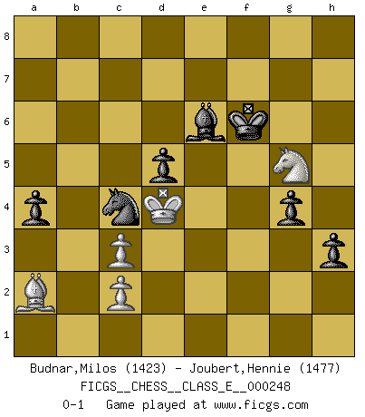 Last move : 0-1 2024 April 30 14:21:21 [Event "FICGS__CHESS__CLASS_E__000248"] [Site "FICGS"] [Date "2024.03.16"] [Round "1"] [White "Budnar,Milos"] [Black "Joubert,Hennie"] [Result "0-1"] [WhiteElo "1423"] [BlackElo "1477"] 1.e4 c5 2.Bc4 Nc6 3.Nf3 e6 4.O-O d6 5.d3 Nf6 6.Bg5 Be7 7.h3 O-O 8.a3 b6 9.Nc3 Bb7 10.d4 cxd4 11.Nxd4 h6 12.Bh4 Nxe4 13.Bxe7 Nxc3 14.bxc3 Qxe7 15.Bb5 Ne5 16.f4 Ng6 17.f5 Ne5 18.fxe6 fxe6 19.Rxf8 Rxf8 20.Qh5 Qf7 21.Qxf7 Rxf7 22.Nxe6 Rf6 23.Nd4 Be4 24.Ba4 a6 25.Rf1 Rxf1+ 26.Kxf1 b5 27.Bb3+ d5 28.a4 bxa4 29.Bxa4 Nc4 30.Ke2 Kf7 31.Nc6 Bxg2 32.Nb4 a5 33.Nc6 Bxh3 34.Bb3 Bd7 35.Nd4 a4 36.Ba2 h5 37.Kd3 h4 38.Nf3 h3 39.Nh2 g5 40.Kd4 Be6 41.Nf3 g4 42.Ng5+ Kf6 0-1 Follow this game move after move (download)Chess is really ninety nine percent calculation. (Soltis) Gott hat gewollt, dass ich Champion werde. (Surab Azmajparaschvili) No es una movida, aún la mejor movida que tu debas buscar, sino un plan comprensible. (Eugene Znosko-Borovsky) La solitude du joueur d'Echecs à l'approche du mat est semblable à celle du condamné. (Francis Szpiner) The meaning of life is that it is to be lived, and it is not to be traded and conceptualized and squeezed into a pattern of systems. (Bruce Lee)