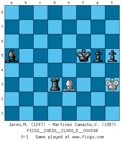 Last move : 0-1 2025 June 4 0:41:19 [Event "FICGS__CHESS__CLASS_E__000248"] [Site "FICGS"] [Date "2024.03.16"] [Round "1"] [White "Jerez,Miriam"] [Black "Martinez Camacho,Victor Hugo"] [Result "0-1"] [WhiteElo "1247"] [BlackElo "1387"] 1.e4 c6 2.Nf3 d5 3.d4 dxe4 4.Ne5 Bf5 5.Bc4 e6 6.O-O Nf6 7.Nc3 Be7 8.h3 Nbd7 9.Be3 Nxe5 10.dxe5 Qxd1 11.Raxd1 O-O 12.exf6 Bxf6 13.b3 Bxc3 14.g4 Bg6 15.h4 h6 16.h5 Bh7 17.a4 a6 18.Rd7 b5 19.axb5 cxb5 20.Be2 b4 21.Rfd1 a5 22.Bb5 f5 23.gxf5 exf5 24.Bc4+ Kh8 25.Kh2 f4 26.Bc5 Rfe8 27.Kh3 Bf5+ 28.Kg2 e3 29.fxe3 fxe3 30.Kf3 Bxd7 31.Rxd7 e2 32.Bxe2 Re6 33.Kg4 Rxe2 34.Kf5 Rxc2 35.Ke4 Re8+ 36.Kf4 Rf8+ 37.Bxf8 Rf2+ 38.Ke3 Rb2 39.Ra7 Rxb3 40.Rxa5 Bf6 41.Ke2 Rh3 42.Bxb4 Rb3 43.Ba3 Kh7 44.Kd2 Rh3 45.Bf8 Bc3+ 46.Kc2 Bxa5 47.Kd1 Rxh5 48.Ke2 Kg8 49.Bd6 Rd5 50.Bf4 g5 51.Be3 Kf7 52.Kf3 Kg6 53.Kg4 h5+ 54.Kg3 Kf5 55.Kh3 Rd3 0-1 This chess game has been lost on time (started : 2024.03.16 15:41:42) Follow this game move after move (download)Some part of a mistake is always correct. (Savielly Tartakover) Die Fehler sind da, Sie warten nur darauf gemacht zu werden. (Savielly Grigorievitsch Tartakower) El Ajedrez es parte de la cultura, y si una cultura esta en decadencia, entonces también el Ajedrez declinará. (Mikhail Botvinnik) Les Echecs sont affaire de jugement sensible. Savoir quand frapper et quand esquiver. (Fischer) Question: Is 'This statement is paradoxical' a paradoxical statement ? Or is it a meta-paradox ? (Normajean Yates)