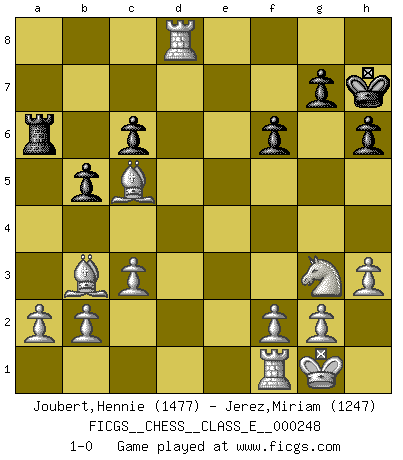 Last move : 1-0 2024 August 19 17:16:55 [Event "FICGS__CHESS__CLASS_E__000248"] [Site "FICGS"] [Date "2024.03.16"] [Round "1"] [White "Joubert,Hennie"] [Black "Jerez,Miriam"] [Result "1-0"] [WhiteElo "1477"] [BlackElo "1247"] 1.e4 e5 2.Bc4 Nf6 3.d4 d5 4.exd5 Nxd5 5.dxe5 Nc6 6.Bxd5 Nxe5 7.Ne2 c6 8.Bb3 Bd6 9.O-O O-O 10.Nbc3 Re8 11.Be3 h6 12.h3 Qf6 13.Ne4 Qd8 14.Qxd6 Qxd6 15.Nxd6 Rd8 16.Nxc8 Raxc8 17.Bxa7 Ra8 18.Bb6 Rd7 19.Rad1 Re7 20.Ng3 Ra6 21.Rd8+ Kh7 22.Bd4 b5 23.Bc5 Nd7 24.Bxe7 Nc5 25.Bxc5 f6 26.c3 1-0 This chess game has been lost on time (started : 2024.03.16 15:41:42) Follow this game move after move (download)Chess is like life. (Boris Spassky) In Buenos Aires ist es nicht mein vorrangiges Ziel ein starkes Turnier zu organisieren, sondern ein Turnier für Gentlemen. Ich würde nie Kamsky einladen. Ich mag keine Probleme. (Miguel Najdorf) No nos podemos resistir a la fascinación de un sacrificio ya que la pasión por los sacrificios es parte de la naturaleza de un jugador de Ajedrez. (Rudolf Spielman) Karpov est une pièce de musée. (Garry Kasparov) The smarter you play, the luckier you'll be. (Mark Pilarski)