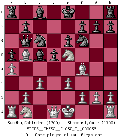 Last move : 1-0 2007 November 6 18:47:9 [Event "FICGS__CHESS__CLASS_C__000059"] [Site "FICGS"] [Date "2007.09.14"] [Round "1"] [White "Sandhu,Gobinder"] [Black "Shammasi,Amir"] [Result "1-0"] [WhiteElo "1700"] [BlackElo "1700"] 1.d4 d5 2.Bf4 c5 3.c3 Nc6 4.Nf3 Nf6 5.dxc5 a5 6.e3 e6 7.Bb5 Bxc5 8.Ne5 Qb6 9.a4 1-0 This chess game has been lost on time (started : 2007.09.14 14:30:58) Queen's pawn, Mason variation, Steinitz counter-gambit Player White won this chess game. Follow this game move after move (download)You may learn much more from a game you lose than from a game you win. You will have to lose hundreds of games before becoming a good player. (Jose Raul Capablanca) Ich las kürzlich ein Buch von Nietzsche. Er sagte Religion verdumme nur die Menschen. Ich stimme zu. (Robert James Fischer) Vive, pierde y aprende al observar a tu oponente como ganar. (Amber Steenbock) On n'a jamais que l'âge auquel on a commence à jouer aux échecs car après on cesse de vieillir. (Capablanca) Men should grow up. - Yeah. And dogs should stop licking themselves. It's not gonna happen. (Gregory House to Dr. Cameron, House M.D.)