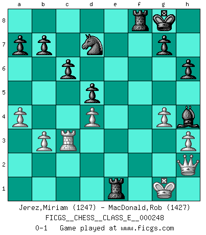 Last move : 0-1 2024 June 1 2:10:28 [Event "FICGS__CHESS__CLASS_E__000248"] [Site "FICGS"] [Date "2024.03.16"] [Round "1"] [White "Jerez,Miriam"] [Black "MacDonald,Rob"] [Result "0-1"] [WhiteElo "1247"] [BlackElo "1427"] 1.e4 e6 2.Nf3 d5 3.exd5 exd5 4.d4 Nf6 5.Bd3 Bd6 6.Nc3 O-O 7.O-O Bg4 8.Re1 c6 9.h3 Bh5 10.Bg5 h6 11.Bh4 Nbd7 12.Be2 Qb6 13.g4 Bg6 14.b3 Rae8 15.a4 Bb4 16.Qd2 Qa5 17.Bd3 Bxc3 18.Qf4 Bxe1 19.Bxg6 fxg6 20.Rc1 g5 21.Qh2 gxh4 22.Nxh4 Ne4 23.f3 Bxh4 24.fxe4 Rxe4 25.c3 Qxc3 26.Rxc3 Re1+ 0-1 Follow this game move after move (download)If cunning alone were needed to excel, women would be the best Chess players. (Albin) Der Verteidiger gebe der Gewalt nach, aber nur der Gewalt. Er schaffe sich nicht freiwillig, etwa aus Blindheit oder aus Schrecken, irgendwelche Schwächen. Er lasse sich nicht bluffen. (Emanuel Lasker) Bobby Fischer es el jugador de Ajedrez mas grande que jamás haya existido. (Ken Smith) Le pion, dans sa simplicité, marche droit devant lui, mais lorsqu'il prend, il le fait obliquement? Ainsi l'homme, tant qu'il reste pauvre, marche dans la droiture et vit honnêtement, mais lorsqu'il recherche les honneurs, il flatte, se parjure et, par les voies obliques, cherche une position supérieure sur l'échiquier du monde. (Jean de Galles) I teach you to lie, cheat and steal, and as soon as my back's turned you wait in line ? (Gregory House, House M.D.)