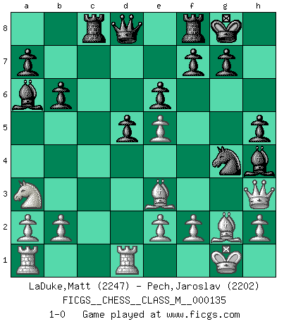 Last move : 1-0 2024 July 16 22:5:24 [Event "FICGS__CHESS__CLASS_M__000135"] [Site "FICGS"] [Date "2024.03.16"] [Round "1"] [White "LaDuke,Matt"] [Black "Pech,Jaroslav"] [Result "1-0"] [WhiteElo "2247"] [BlackElo "2202"] 1.d4 d5 2.Nf3 Nf6 3.c4 e6 4.g3 Bb4+ 5.Bd2 Be7 6.Bg2 c6 7.O-O O-O 8.Qc2 b6 9.Ne5 Bb7 10.Bf4 Nbd7 11.Rd1 Nh5 12.Bd2 Nhf6 13.cxd5 cxd5 14.g4 Rc8 15.Qd3 Nxe5 16.dxe5 Nxg4 17.Qg3 h5 18.Qh3 Bh4 19.Be3 Ba6 20.Na3 1-0 Follow this game move after move (download)It is the aim of the modern school, not to treat every position according to one general law, but according to the principle inherent in the position. (Richard Reti) Ich glaube nicht an Psychologie, ich glaube an gute Züge. (Robert James Fischer) Bobby es la celebridad menos entendida y malinterpretada que camina el la faz de esta tierra. (Yasser Seirawan) La solitude du joueur d'Echecs à l'approche du mat est semblable à celle du condamné. (Francis Szpiner) Whoever said the pen is mightier than the sword obviously never encountered automatic weapons. (US General Douglas MacArthur)