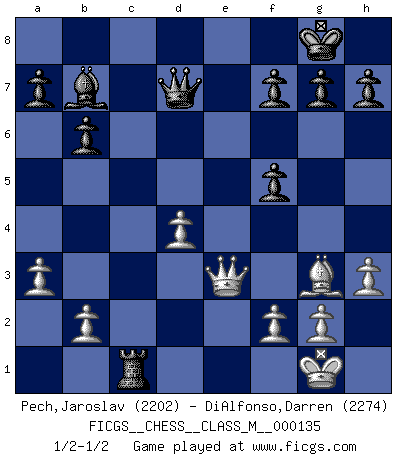 Last move : 1/2-1/2 2024 August 9 4:30:22 [Event "FICGS__CHESS__CLASS_M__000135"] [Site "FICGS"] [Date "2024.03.16"] [Round "1"] [White "Pech,Jaroslav"] [Black "DiAlfonso,Darren"] [Result "1/2-1/2"] [WhiteElo "2202"] [BlackElo "2274"] 1.d4 Nf6 2.c4 e6 3.Nc3 Bb4 4.e3 O-O 5.Bd3 d5 6.Nf3 dxc4 7.Bxc4 c5 8.O-O cxd4 9.exd4 b6 10.Bg5 Bb7 11.Qe2 Nbd7 12.Rac1 Bxc3 13.Rxc3 Qb8 14.Bh4 Nd5 15.R3c1 Qd6 16.Bg3 Qe7 17.a3 Rfd8 18.Rfd1 Rac8 19.Ne5 N7f6 20.Bd3 Ne8 21.Rxc8 Rxc8 22.Ng4 Nd6 23.h3 Qd7 24.Ne3 Nxe3 25.Qxe3 Nf5 26.Bxf5 exf5 27.Rc1 Rxc1+ 1/2-1/2 Follow this game move after move (download)Chess is a terrible game. If you have no center, your opponent has a freer position. If you do have a center, then you really have something to worry about ! (Siegbert Tarrasch) Wenn ich einen Club besuche, sind die Spieler stumm vor Staunen. (José Raúl Capablanca) Algunos sacrificios son sólidos, los demás son míos. (Mikhail Tal) Les échecs c'est le défi de l'alpiniste, toujours plus haut, prêt à tout pour monter à l'assaut du Roi ennemi. Les échecs, c'est de la musique en mouvement, un ballet majestueux pour les yeux. C'est de la poésie composée par les fantômes du passé qui au même titre que Rimbaud ou Verlaine méritent notre admiration. Les échecs, c'est de la peinture ou le moindre mouvement modifie le tableau pour en faire un Picasso ou un Van Gogh. Les échecs, c'est tout et rien, c'est la vie et la mort. Jjulie33 sur le forum de France-Echecs. Political correctness is subjecting us to gross incompetence. (Johann Piek)