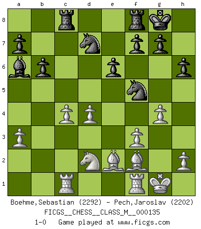 Last move : 1-0 2024 July 13 14:28:11 [Event "FICGS__CHESS__CLASS_M__000135"] [Site "FICGS"] [Date "2024.03.16"] [Round "1"] [White "Boehme,Sebastian"] [Black "Pech,Jaroslav"] [Result "1-0"] [WhiteElo "2292"] [BlackElo "2202"] 1.d4 d5 2.Nf3 Nf6 3.c4 c6 4.Nc3 e6 5.Bg5 Nbd7 6.e3 Qa5 7.cxd5 Nxd5 8.Qd2 Bb4 9.Rc1 h6 10.Bh4 c5 11.a3 Bxc3 12.bxc3 b6 13.c4 Qxd2+ 14.Nxd2 Ne7 15.f3 Ba6 16.Be2 cxd4 17.exd4 Rc8 18.O-O Nf5 19.Bf2 O-O 20.g4 1-0 Follow this game move after move (download)A bad plan is better than none at all. (Frank Marshall) Schach ist wie eine schöne Frau, zu der wir ständig zurückkehren, gleichviel, wie oft sie uns zurückweist. (Anonymous) Botvinnik trató de alejar el misterio referente al Ajedrez, siempre relacionandolo a situaciones de la vida diaria. Solía llamar al Ajedrez un problema inexacto típico, similar a aquellos en que la gente tiene siempre que resolver a cada día. (Garry Kasparov) C'est la seule position que je connaisse où les deux camps sont mals. Propos prêtés à V. Anand. A clear conscience is usually the sign of a bad memory. (Unknown)