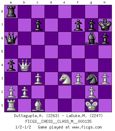 Last move : 1/2-1/2 2024 June 23 8:9:22 [Event "FICGS__CHESS__CLASS_M__000135"] [Site "FICGS"] [Date "2024.03.16"] [Round "1"] [White "Duttagupta,Aniruddha"] [Black "LaDuke,Matt"] [Result "1/2-1/2"] [WhiteElo "2263"] [BlackElo "2247"] 1.e4 e5 2.Nf3 Nc6 3.Bb5 Nf6 4.d3 Bc5 5.c3 O-O 6.O-O d5 7.Nbd2 dxe4 8.dxe4 a5 9.Bxc6 bxc6 10.Nxe5 Re8 11.Nb3 Bd6 12.Nxc6 Qd7 13.e5 Qxc6 14.exd6 a4 15.Nd4 Qxd6 16.Nc2 Qb6 17.Re1 Bg4 18.Qd3 Rxe1+ 19.Nxe1 h6 20.Nc2 Bh5 21.Ne3 Bg6 22.Qc4 Kh7 23.h3 Ne4 24.Qb4 Qa6 25.f3 Ng3 26.Kf2 Nh1+ 27.Kg1 Ng3 1/2-1/2 Follow this game move after move (download)Chess is the art of analysis. (Mikhail Botvinnik) Wenn du nicht weißt was du tun sollst, warte bis dein Gegner eine Idee hat. Sie wird sicher schlecht sein. (Siegbert Tarrasch) Los Peones son nacidos libres, y aún así, se encuentran por doquier encadenados. (Rick Kennedy) Les échecs, c'est la lutte contre l'erreur. (Johannes Zukertort) I couldn't make any sense out of what this particular thread is about. It sounds like R2 D2 computer speaking. A space fight ?!? Some 'command' problems in Moscow ? Some killers & narcotic addicts attacking some game & a god wannabe ?? (Dinesh De Silva, lost in a russian conflict in FICGS forum)