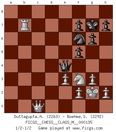 Last move : 1/2-1/2 2024 July 17 23:35:25 [Event "FICGS__CHESS__CLASS_M__000135"] [Site "FICGS"] [Date "2024.03.16"] [Round "1"] [White "Duttagupta,Aniruddha"] [Black "Boehme,Sebastian"] [Result "1/2-1/2"] [WhiteElo "2263"] [BlackElo "2292"] 1.d4 Nf6 2.Bg5 d5 3.Bxf6 exf6 4.e3 Bd6 5.c4 dxc4 6.Bxc4 f5 7.Nc3 Nd7 8.Nf3 g6 9.O-O O-O 10.Qc2 Nf6 11.Nb5 Kg7 12.a4 Bb4 13.Rfd1 Qe7 14.Nc3 Bd6 15.g3 c6 16.d5 Re8 17.b3 Rd8 18.a5 Rb8 19.dxc6 bxc6 20.a6 Be6 21.Ne2 Rb6 22.Nf4 Bxc4 23.Qxc4 Rd7 24.Kg2 Bc7 25.Rxd7 Qxd7 26.Qc3 Qe7 27.Ra4 Bd6 28.Rc4 Bb4 29.Qc1 Rxa6 30.Nd3 Rb6 31.Nxb4 Rxb4 32.Rxc6 Rxb3 33.Rc7 Qe4 34.Rxa7 Rb7 35.Rxb7 1/2-1/2 Follow this game move after move (download)It is no time to be playing Chess when the house is on fire. (Italian Proverb) Die Partien sind immer verschieden, die Interviews immer die gleichen. (Garry Kasparov) El hombre es un frívolo, una creatura engañosa y como un jugador de Ajedrez, se preocupa mas por el proceso de obtener su meta que de la meta por sí misma. (Dostoyevsky) Le génie consiste à savoir transgresser les règles au moment opportun. (Teichmann) When a man with money meets a man with experience, the man with experience leaves with money and the man with money leaves with experience. (Anonymous)