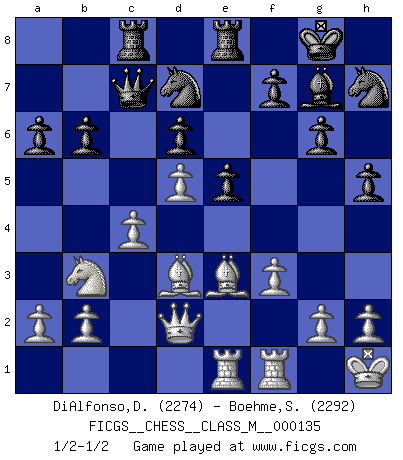 Last move : 1/2-1/2 2024 March 31 23:14:10 [Event "FICGS__CHESS__CLASS_M__000135"] [Site "FICGS"] [Date "2024.03.16"] [Round "1"] [White "DiAlfonso,Darren"] [Black "Boehme,Sebastian"] [Result "1/2-1/2"] [WhiteElo "2274"] [BlackElo "2292"] 1.e4 c5 2.Nf3 d6 3.d4 cxd4 4.Nxd4 Nf6 5.Nc3 a6 6.Be3 e5 7.Nb3 Be6 8.f3 h5 9.Be2 Nbd7 10.Nd5 Bxd5 11.exd5 Rc8 12.c4 g6 13.Qd2 b6 14.O-O Bg7 15.Kh1 O-O 16.Rae1 Re8 17.Bg5 Qc7 18.Bd3 Nh7 19.Be3 Nhf6 20.Bg5 Nh7 21.Be3 1/2-1/2 Follow this game move after move (download)Chess makes man wiser and clear-sighted. (Vladimir Putin) Die starken Figuren des Gegners muss man abtauschen. (José Raúl Capablanca) El Ajedrez lo es todo: arte, ciencia y deporte. (Anatoly Karpov) Un millionnaire : 'Monsieur Steinitz ! Vous ne participez aux tournois que pour l'argent, alors que moi je n'y viens que pour l'honneur.' Steinitz : 'Chacun joue pour ce qu'il n'a pas'... Even the best needles are not sharp at both ends. (Chinese proverb)