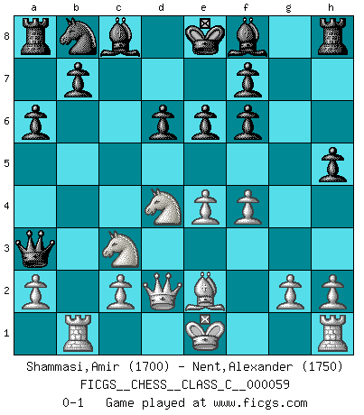 Last move : 0-1 2007 December 8 20:29:42 [Event "FICGS__CHESS__CLASS_C__000059"] [Site "FICGS"] [Date "2007.09.14"] [Round "1"] [White "Shammasi,Amir"] [Black "Nent,Alexander"] [Result "0-1"] [WhiteElo "1700"] [BlackElo "1750"] 1.e4 c5 2.Nf3 d6 3.d4 cxd4 4.Nxd4 Nf6 5.Nc3 a6 6.Bg5 e6 7.f4 Qb6 8.Qd2 Qxb2 9.Rb1 Qa3 10.Bxf6 gxf6 11.Be2 h5 0-1 Sicilian : Najdorf, 7...Qb6 Player Black won this chess game. Follow this game move after move (download)Who is your opponent tonight, tonight I am playing against the Black pieces. (Akiba Rubinstein) Ich habe Putins Aufstieg an die Macht beobachtet und seine Politik, die demokratischen Institutionen meines Landes zu zerstören. (Garry Kasparov) Mi estilo es algo parecido entre un poco de Tal y Petrosian. (Reshevsky) Je menace de comprendre la position. (Anonyme) The ultimate in disposing one's troops is to be without ascertainable shape. Then the most penetrating spies cannot pry in nor can the wise lay plans against you. (Sun Tzu)