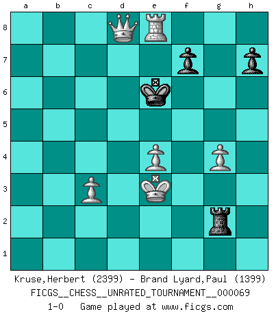 Last move : 1-0 2024 April 3 18:4:59 [Event "FICGS__CHESS__UNRATED_TOURNAMENT__000069"] [Site "FICGS"] [Date "2024.03.25"] [Round "1"] [White "Kruse,Herbert"] [Black "Brand Lyard,Paul"] [Result "1-0"] [WhiteElo "2399"] [BlackElo "1399"] 1.e4 e5 2.Nf3 Nc6 3.Bb5 d6 4.d4 Bd7 5.Nc3 a6 6.Bxc6 Bxc6 7.dxe5 dxe5 8.Qxd8+ Rxd8 9.Nxe5 Bb4 10.Nxc6 Bxc3+ 11.bxc3 bxc6 12.Bf4 Rc8 13.Rb1 Nf6 14.f3 O-O 15.Rb7 c5 16.Bxc7 Rfe8 17.Bg3 Nh5 18.Kf2 Nxg3 19.hxg3 Rcd8 20.Re1 Rd2+ 21.Re2 Rxe2+ 22.Kxe2 g5 23.g4 c4 24.Rb6 Ra8 25.a4 a5 26.Rc6 Rb8 27.Rxc4 Rb2 28.Kd3 Rb1 29.Rc5 Rg1 30.Rxg5+ Kf8 31.Rxa5 Rxg2 32.Ra8+ Ke7 33.a5 Rf2 34.a6 Rxf3+ 35.Kd4 Rf2 36.a7 Rxc2 37.Rh8 Ra2 38.a8Q Rd2+ 39.Ke3 Rg2 40.Qd8+ Ke6 41.Re8+ 1-0 Follow this game move after move (download)For me, Chess is life and every game is like a new life. Every Chess player gets to live many lives in one lifetime. (Eduard Gufeld) Spielt Blackmar-Diemer-Gambit, und das Matt kommt von selbst! (Emil Joseph Diemer) Fischer era un maestro de claridad y un Rey del posicionamiento astuto. Sus oponentes podían ver hacia donde se dirigía pero eran impotentes para detenerlo. (Bruce Pandolfini) Il n'y a pas eu de défaite parce que je ne crois pas que cet ordinateur ait jamais existé. IBM a triché en refusant d'imprimer les modes de recherche de la machine. C'est évident, pendant le match, des coups décisifs ont été joués par des êtres humains. Aujourd'hui, les meilleurs spécialistes en informatique ne peuvent toujours pas expliquer comment Deep-Blue a pu jouer contre la logique des ordinateurs. IBM a gagné une guerre de communication, mais ils sont incapables de prouver que l'ordinateur a gagné tout seul. (Garry Kasparov) The greatest con, that he ever pulled... was making you believe... that he is you. (Revolver, movie)