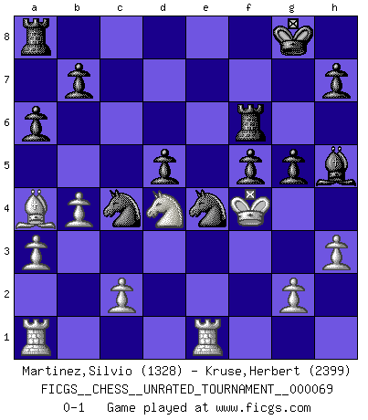 Last move : 0-1 2024 May 5 1:16:31 [Event "FICGS__CHESS__UNRATED_TOURNAMENT__000069"] [Site "FICGS"] [Date "2024.03.25"] [Round "1"] [White "Martinez,Silvio"] [Black "Kruse,Herbert"] [Result "0-1"] [WhiteElo "1328"] [BlackElo "2399"] 1.e4 c5 2.d4 cxd4 3.Qxd4 Nc6 4.Qd1 Nf6 5.Nc3 e6 6.Nf3 Bb4 7.Bd2 d5 8.exd5 exd5 9.a3 Ba5 10.b4 Bb6 11.Bb5 Qe7+ 12.Qe2 Qxe2+ 13.Nxe2 O-O 14.O-O Bg4 15.Ne5 Nxe5 16.Rfe1 a6 17.Ba4 Bxf2+ 18.Kxf2 Ne4+ 19.Ke3 Nc4+ 20.Kd3 Ncxd2 21.h3 Bf5 22.Nd4 Bg6 23.Ke3 Nc4+ 24.Kf3 f5 25.Ne6 Bh5+ 26.Kf4 Rf6 27.Nd4 g5+ 0-1 Follow this game move after move (download)Weak points or holes in the opponent's position must be occupied by pieces not Pawns. (Siegbert Tarrasch) Jeder weiß, dass Gasprom Putins persönliches Machtinstrument ist. Die Firma wird vom Kreml aus geleitet und wird schon deshalb nie transparent sein. (Garry Kasparov) Si pudieramos observar el interior de la cabeza de un jugador de Ajedrez, encontraríamos ahí un mundo lleno de sentimientos, imágenes, ideas, emoción y pasión. (Alfred Binet) Le thème de l'attaque double intervient d'une manière ou d'une autre dans l'immense majorité des combinaisons. (Youri Averbakh) It's not the will to win, but the will to prepare to win that makes the difference. (Bear Bryant)