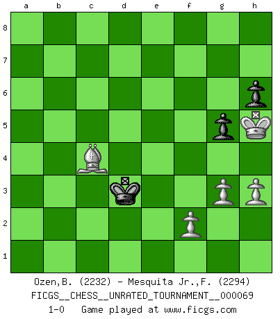 Last move : 1-0 2024 August 8 14:23:35 [Event "FICGS__CHESS__UNRATED_TOURNAMENT__000069"] [Site "FICGS"] [Date "2024.03.25"] [Round "1"] [White "Ozen,Bahadir"] [Black "Mesquita Jr.,Fausto Monteiro"] [Result "1-0"] [WhiteElo "2232"] [BlackElo "2294"] 1.Nf3 Nf6 2.g3 d5 3.Bg2 c6 4.O-O Bg4 5.h3 Bh5 6.d3 Bxf3 7.Bxf3 e5 8.e4 dxe4 9.dxe4 Nbd7 10.Nd2 Bc5 11.a4 a5 12.Qe2 O-O 13.Kg2 h6 14.Nc4 Qc7 15.Bd2 Rfd8 16.Rfd1 Nb6 17.Bxa5 Rxd1 18.Rxd1 Bd4 19.c3 Bc5 20.b4 Rxa5 21.Nxa5 Nxa4 22.Qc2 Nxc3 23.Qxc3 Bd4 24.Rxd4 exd4 25.Qxd4 b6 26.Nc4 c5 27.bxc5 bxc5 28.Qd6 Qxd6 29.Nxd6 Kf8 30.e5 Nd7 31.Nc4 Ke7 32.Bd5 Nxe5 33.Nxe5 Kd6 34.Bxf7 Kxe5 35.Kf3 Kd4 36.Kf4 g5+ 37.Kg4 Kd3 38.Kh5 c4 39.Bxc4+ 1-0 Follow this game move after move (download)If a ruler does not understand Chess, how can he rule over a kingdom ? (King Khusros II) Ein Remis kann durch Wiederholung von drei Zügen oder durch einen schlechte Zug erreicht werden. (Savielly Grigorievitsch Tartakower) Yo tuve un dolor de muelas en la primer partida. En el segundo juego, tuve un dolor de cabeza. En el tercero, tuve un ataque de reumatísmo. En la cuarta partida, no me sentía muy bien. ¿Y en el quinto juego? Bueno, ¿que acaso uno tiene que ganar todos los juegos?. (Siegbert Tarrasch) Le temps de noter son nom sur la feuille de partie, j'étais déjà en zeitnot ! D'un modeste amateur apparié lors de la première ronde d'un open contre le grand-maître Azmaïparashvili. They misunderestimated me. (George W. Bush, Bentonville nov. 6, 2000)