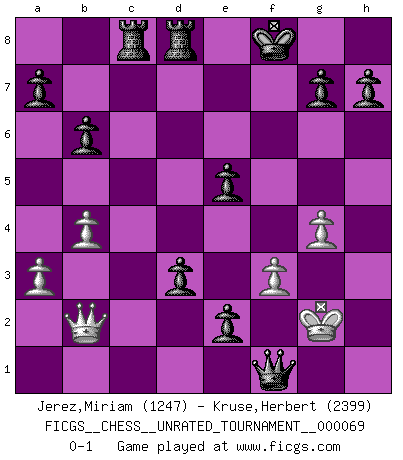 Last move : 0-1 2024 May 11 0:59:53 [Event "FICGS__CHESS__UNRATED_TOURNAMENT__000069"] [Site "FICGS"] [Date "2024.03.25"] [Round "1"] [White "Jerez,Miriam"] [Black "Kruse,Herbert"] [Result "0-1"] [WhiteElo "1247"] [BlackElo "2399"] 1.e4 c5 2.d4 cxd4 3.Qxd4 Nc6 4.Qd1 Nf6 5.Nc3 e6 6.Nf3 Bb4 7.Bd2 d5 8.a3 dxe4 9.Ng1 Bxc3 10.Bxc3 O-O 11.Ne2 Qe7 12.Nd4 Rd8 13.Bb4 Nxb4 14.c3 Nc6 15.Bc4 Nxd4 16.cxd4 e5 17.Qb3 exd4 18.O-O Be6 19.Bxe6 fxe6 20.Rfe1 Rac8 21.Rad1 Kf8 22.h3 b6 23.Qa4 e5 24.f3 e3 25.b4 Nd5 26.g4 Nc3 27.Qb3 Nxd1 28.Rxd1 e2 29.Re1 d3 30.h4 Qxh4 31.Qb2 Qxe1+ 32.Kg2 Qf1+ 0-1 Follow this game move after move (download)Up to this point White has been following well-known analysis. But now he makes a fatal error: he begins to use his own head. (Siegbert Tarrasch) Ihnen, Herr Lasker, habe ich nur drei Worte zu sagen: Schach und matt. (Siegbert Tarrasch) Ser exitoso en el Ajedrez te permite descubrir tu propia personalidad. Eso es lo que deseo para los niños de mi clase. (Saudin Robovic) Toutes choses étant égales, c'est la conviction qui gagne. Alliée à une volonté de vaincre, elle sert de détonateur, suscite des idées, disperse les doutes et aide à penser clairement. (Robert Fischer) The Internet isn't free. It just has an economy that makes no sense to capitalism. (Brad Shapcott)