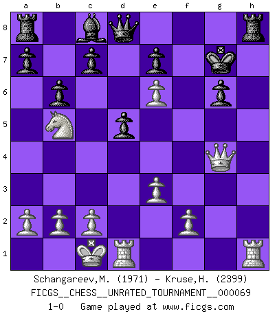 Last move : 1-0 2024 March 27 0:15:52 [Event "FICGS__CHESS__UNRATED_TOURNAMENT__000069"] [Site "FICGS"] [Date "2024.03.25"] [Round "1"] [White "Schangareev,Mirzian"] [Black "Kruse,Herbert"] [Result "1-0"] [WhiteElo "1971"] [BlackElo "2399"] 1.Nc3 d5 2.d4 Nf6 3.Nf3 g6 4.Bf4 Bg7 5.e3 O-O 6.Be2 b6 7.Ne5 Bb7 8.h4 h5 9.g4 hxg4 10.Bxg4 Nc6 11.h5 Nxe5 12.Bxe5 Nxg4 13.Qxg4 Bxe5 14.dxe5 Kg7 15.hxg6 fxg6 16.Nb5 Rh8 17.O-O-O Bc8 18.e6 1-0 Follow this game move after move (download)No Chess Grandmaster is normal; they only differ in the extent of their madness. (Viktor Korchnoi) Nie in meinem Leben habe ich die französische Verteidigung gespielt, welche die Stumpfsinnigste von allen ist. (Wilhelm Steinitz) El jugador blanco perdió porque fallo en recordar la coreccta continuación y tuvo que pensar por sí mismo las movidas. (Siegbert Tarrasch) La vérité est comme le meilleur coup aux échecs : elle existe, mais il faut la chercher. (Arturo Perez-Reverte) I can't decide which is riskier; taking crazy risks, or taking advice on crazy risks from a crazy risk taker. (Gregory House in House M.D.)