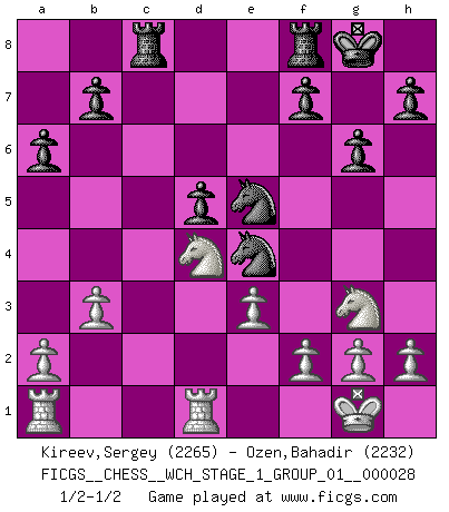 Last move : 1/2-1/2 2024 April 15 9:46:23 [Event "FICGS__CHESS__WCH_STAGE_1_GROUP_01__000028"] [Site "FICGS"] [Date "2024.03.26"] [Round "1"] [White "Kireev,Sergey"] [Black "Ozen,Bahadir"] [Result "1/2-1/2"] [WhiteElo "2265"] [BlackElo "2232"] 1.d4 d5 2.Nf3 Nf6 3.c4 e6 4.Nc3 c6 5.e3 Nbd7 6.Be2 Bd6 7.Qc2 O-O 8.b3 e5 9.cxd5 cxd5 10.Nb5 Bb4+ 11.Bd2 Bxd2+ 12.Nxd2 a6 13.dxe5 Nxe5 14.Nd4 Bg4 15.Bxg4 Nfxg4 16.O-O Rc8 17.Qf5 g6 18.Qf4 Qd6 19.Rfd1 Nf6 20.Nf1 Nh5 21.Qh4 Qf6 22.Qxf6 Nxf6 23.Ng3 Ne4 1/2-1/2 Follow this game move after move (download)I look one move ahead... the best ! (Siegbert Tarrasch) Das Spiel gibt uns die Genugtuung, die das Leben uns versagt. (Emanuel Lasker) Los tropiezos estan todos ahí en el tablero, esperando que se cometan. (Savielly Tartakover) L'action d'une oeuvre littéraire se déroule sur un champ de bataille. Les masques et les types du drame moderne correspondent aux pièces du jeu d'échecs. L'intrigue correspond aux coups et aux gambits, c'est à dire aux techniques du jeu telles qu'utilisées et interprétées par les joueurs. Les tactiques et les péripéties [mouvements] correspondent aux coups exécutés par l'adversaire. (Viktor Shklovsky) The mind is like a parachute, it only functions when its open. (Unknown)