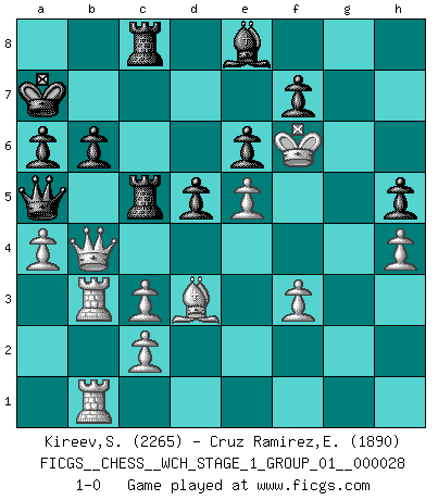 Last move : 1-0 2024 April 8 16:28:14 [Event "FICGS__CHESS__WCH_STAGE_1_GROUP_01__000028"] [Site "FICGS"] [Date "2024.03.26"] [Round "1"] [White "Kireev,Sergey"] [Black "Cruz Ramirez,Eliecer"] [Result "1-0"] [WhiteElo "2265"] [BlackElo "1890"] 1.d4 e6 2.e4 d5 3.Nc3 Nf6 4.Bg5 Bb4 5.e5 h6 6.Bd2 Bxc3 7.bxc3 Ne4 8.Qg4 g6 9.Bd3 Nxd2 10.Kxd2 c5 11.h4 Nc6 12.Qf4 Bd7 13.dxc5 Qe7 14.Ne2 O-O-O 15.Nd4 Qxc5 16.Nxc6 Bxc6 17.Qd4 b6 18.g3 h5 19.Rhb1 Rd7 20.Ba6+ Kc7 21.a4 Qa5 22.Bd3 Rc8 23.Rb2 Kd8 24.Ra3 Rb7 25.R2b3 Rbc7 26.Kc1 Bd7 27.Bb5 a6 28.Be2 Rc5 29.Bd3 Kc7 30.Kd2 Kb7 31.Qb4 Ka7 32.Ke3 Be8 33.f3 R8c7 34.g4 Rc8 35.Kf4 Bd7 36.Kg5 Be8 37.Kf6 R8c7 38.gxh5 gxh5 39.Rb1 Rc8 40.Rab3 1-0 Follow this game move after move (download)Dazzling combinations are for the many, shifting wood is for the few. (Georg Kieninger) Viele Opfer benötigen überhaupt keine konkrete Berechnung. Es genügt sich die entstehende Position kurz vorzustellen, um uns davon zu überzeugen, dass das Opfer korrekt ist. (Mikhail Nekhemyevich Tal) Mi estilo es algo parecido entre un poco de Tal y Petrosian. (Reshevsky) Le plus grand jeu de l'esprit jamais inventé, plus vous l'apprenez, plus vous y prenez du plaisir. (Garry Kasparov) If you ain't just a little scared when you enter a casino, you are either very rich or you haven't studied the games enough. (Pappy)