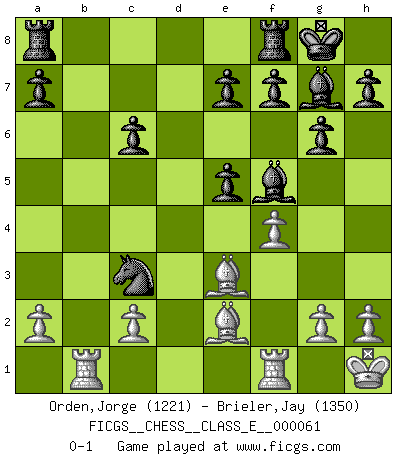 Last move : 0-1 2007 September 26 13:25:7 [Event "FICGS__CHESS__CLASS_E__000061"] [Site "FICGS"] [Date "2007.09.14"] [Round "1"] [White "Orden,Jorge"] [Black "Brieler,Jay"] [Result "0-1"] [WhiteElo "1221"] [BlackElo "1350"] 1.e4 c5 2.Nf3 d6 3.d4 Nf6 4.Nc3 cxd4 5.Nxd4 g6 6.Be2 Bg7 7.O-O O-O 8.f4 Nc6 9.Nxc6 bxc6 10.b4 Qb6+ 11.Kh1 Qxb4 12.e5 dxe5 13.Qd3 Bf5 14.Qd2 Ne4 15.Rb1 Qxc3 16.Qe3 Qxe3 17.Bxe3 Nc3 0-1 Sicilian Kingside Castling by player White (move 7) Kingside Castling by player Black (move 7) Player Black won this chess game. Follow this game move after move (download)We must make sure that Chess will not be like a dead language, very interesting, but for a very small group. (Sytze Faber) Frage: Gibt es etwas was Sie mehr lieben als Autobahnen ohne Tempobegrenzungen? - Antwort: Deutsche Frauen ohne Tempobegrenzungen. (Loek van Wely) El muchacho (en ese entonces un niño de 12 años llamado Anatoly Karpov) no tiene ni idea de lo que es el Ajedrez y no hay futuro en absoluto para el en esta profesión. (Mikhail Botvinnik) Plusieurs personnes se sont demandées comment Tal faisait pour gagner... En fait, c'est très simple ! Il met ses pièces au centre de l'échiquier et les sacrifie quelque part ! (David Bronstein) The problem with troubleshooting is that trouble shoots back. (Anonymous)