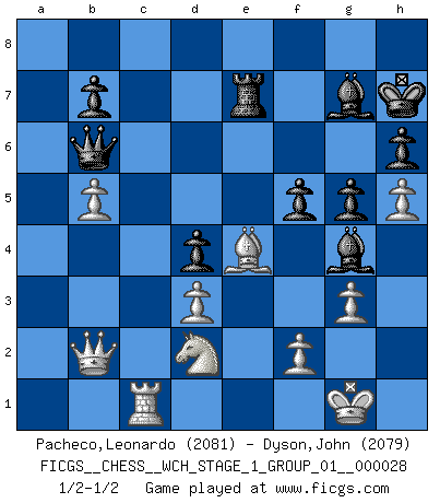 Last move : 1/2-1/2 2024 May 2 16:35:25 [Event "FICGS__CHESS__WCH_STAGE_1_GROUP_01__000028"] [Site "FICGS"] [Date "2024.03.26"] [Round "1"] [White "Pacheco,Leonardo"] [Black "Dyson,John"] [Result "1/2-1/2"] [WhiteElo "2081"] [BlackElo "2079"] 1.Nf3 d5 2.g3 g6 3.Bg2 Bg7 4.O-O e5 5.d3 Nc6 6.Nbd2 h6 7.e4 Nge7 8.Re1 d4 9.Nc4 O-O 10.c3 Be6 11.cxd4 exd4 12.h4 a5 13.Bf4 Re8 14.Rc1 a4 15.Qd2 Kh7 16.b4 axb3 17.axb3 Nc8 18.b4 Nd6 19.Bxd6 cxd6 20.e5 dxe5 21.Nfxe5 Nxe5 22.Nxe5 Bb3 23.Nf3 Qb6 24.h5 g5 25.Rxe8 Rxe8 26.Qb2 Be6 27.Nd2 Bg4 28.b5 Re7 29.Be4+ f5 1/2-1/2 Follow this game move after move (download)No one ever won a game by resigning. (Unknown) Ich hatte meine größten Erfolge, als ich 47 Jahre alt war. Kasparow war noch nicht mal 42 und hat das Schach schon im Stich gelassen. (Viktor Kortschnoi) A través de las casillas del tablero, los Indios explican el movimiento del tiempo y la edad, las influencias mas altas que controlan el mundo y los lazos que vinculan al Ajedrez con el alma humana. (Al-Masudi) Les sacrifices démontrent seulement que quelqu'un a gaffé. (Savielly Tartacover) When the going gets tactical, the computers get going. (Hyatt)