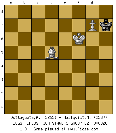 Last move : 1-0 2024 August 7 22:14:32 [Event "FICGS__CHESS__WCH_STAGE_1_GROUP_02__000028"] [Site "FICGS"] [Date "2024.03.26"] [Round "1"] [White "Duttagupta,Aniruddha"] [Black "Hallqvist,Niklas"] [Result "1-0"] [WhiteElo "2263"] [BlackElo "2237"] 1.Nf3 c5 2.c4 g6 3.e4 Bg7 4.d4 e6 5.dxc5 Na6 6.Nc3 Nxc5 7.e5 d6 8.Bg5 f6 9.exf6 Nxf6 10.b4 h6 11.Be3 Ng4 12.Rc1 Nxe3 13.fxe3 Nd7 14.Qxd6 Ne5 15.Nb5 Qxd6 16.Nxd6+ Ke7 17.c5 Rf8 18.Be2 b6 19.Ne4 Bb7 20.Nxe5 Bxe4 21.Bf3 Rad8 22.Bxe4 Bxe5 23.c6 Bd6 24.Rb1 g5 25.Ke2 b5 26.Bf3 a6 27.h4 Rc8 28.Rbc1 Bxb4 29.hxg5 hxg5 30.Rh7+ Rf7 31.Rh6 Kd6 32.Rd1+ Kc7 33.Rxe6 Rh8 34.Rg6 Re7 35.Rxg5 Bd6 36.Rf5 Rhe8 37.Rd3 Rh8 38.Rf6 Bc5 39.Bg4 Rd8 40.Rd7+ R8xd7 41.cxd7 Rxe3+ 42.Kf1 Be7 43.Rxa6 Bh4 44.Re6 Ra3 45.Re8 Bd8 46.Re2 b4 47.Rc2+ Kd6 48.Re2 b3 49.Re6+ Kc7 50.axb3 Rxb3 51.Bf5 Rb4 52.g3 Ra4 53.Re2 Ra5 54.g4 Ra3 55.Rc2+ Kd6 56.Rc8 Ke7 57.Rc6 Ra1+ 58.Ke2 Ra2+ 59.Kf3 Ra3+ 60.Kf4 Ra4+ 61.Kg5 Kf7 62.Kh6 Ra5 63.Rg6 Ra1 64.Be6+ Ke7 65.Kg7 Ba5 66.Bf5 Bc3+ 67.Kh7 Rh1+ 68.Rh6 Rxh6+ 69.Kxh6 Ba5 70.g5 Bd2 71.Kh5 Bc3 72.Kg4 Bd2 73.g6 Bc3 74.Kf3 Bg7 75.Ke4 Bf6 76.Kd5 Bc3 77.Bg4 Ba5 78.Kc6 Kf6 79.Bh5 Kg7 80.Kb7 Bd8 81.Kc8 Be7 82.d8Q Bxd8 83.Kxd8 Kg8 84.Ke7 Kg7 85.Ke6 Kh6 86.Kf5 Kg7 87.Bf3 Kh8 88.Kf6 Kg8 89.g7 Kh7 90.Bd5 1-0 Follow this game move after move (download)Chess holds its master in its own bonds, shackling the mind and brain so that the inner freedom of the very strongest must suffer. (Albert Einstein) Ein Isolani verdüstert die Stimmung auf dem ganzen Schachbrett. (Savielly Grigorievitsch Tartakower) No soy una persona materialista y por eso, no resiento la falta o pérdida del dinero. La ausencia de cosas mundanas carece de importancia. Ya que el Ajedrez es una forma en la que puedo ser tan materialista como yo desee sin tener la necesidad de vender mi alma. (Jamie Walter Adams) Le jeu d'échecs est comme rejeté hors du temps. (Antoine de Saint-Exupéry) Whatever you do, don't be bored. This is absolutely the most exciting time we could have possibly hoped to be alive. And things are just starting. (From movie Waking life)
