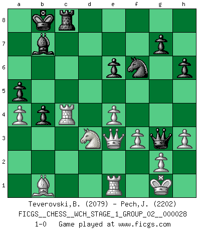 Last move : 1-0 2024 July 7 4:6:44 [Event "FICGS__CHESS__WCH_STAGE_1_GROUP_02__000028"] [Site "FICGS"] [Date "2024.03.26"] [Round "1"] [White "Teverovski,Bogoljub"] [Black "Pech,Jaroslav"] [Result "1-0"] [WhiteElo "2079"] [BlackElo "2202"] 1.d4 d5 2.c4 c6 3.Nf3 Nf6 4.Nc3 e6 5.e3 Nbd7 6.Bd3 dxc4 7.Bxc4 b5 8.Bd3 a6 9.e4 c5 10.d5 Qc7 11.O-O Bb7 12.Bc2 O-O-O 13.dxe6 Ne5 14.Qe2 Nxf3+ 15.Qxf3 fxe6 16.Bf4 Bd6 17.Bxd6 Rxd6 18.Rac1 Rd2 19.h3 Rhd8 20.Qe3 Qe5 21.a4 b4 22.Nd5 Rd4 23.Nf4 Kb8 24.Rfe1 a5 25.Bb1 Rc8 26.b3 h6 27.f3 c4 28.bxc4 Rdxc4 29.Nd3 Qg3 30.Rxc4 1-0 Follow this game move after move (download)Chess, like any creative activity, can exist only through the combined efforts of those who have creative talent, and those who have the ability to organize their creative work. (Mikhail Botvinnik) Wer der Ansicht ist, daß alle Schachspieler verrückt sind, wird durch Studium des Lebens von Emil Josef Diemer nicht auf andere Gedanken kommen. (Hans Ree) El Ajedrez es parte de una cultura y si una cultura esta en decadencia, entonces también el Ajedrez declinará. (Mikhail Botvinnik) J'ai toujours senti une vague pitié pour l'homme qui ne connaît rien aux échecs, tout comme j'en aurais pour un homme ignorant de l'amour. Les Echecs, comme la musique ou comme l'amour, ont le pouvoir de rendre heureux. (Siegbert Tarrasch) Memory is a crazy woman that hoards colored rags and throws away food. (Austin O'Malley)