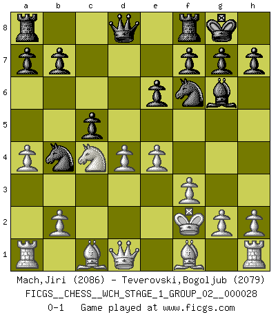 Last move : 0-1 2024 May 25 14:6:27 [Event "FICGS__CHESS__WCH_STAGE_1_GROUP_02__000028"] [Site "FICGS"] [Date "2024.03.26"] [Round "1"] [White "Mach,Jiri"] [Black "Teverovski,Bogoljub"] [Result "0-1"] [WhiteElo "2086"] [BlackElo "2079"] 1.d4 d5 2.c4 dxc4 3.Nf3 Nf6 4.Nc3 c6 5.a4 Bf5 6.Ne5 e6 7.f3 Bb4 8.Nxc4 O-O 9.Kf2 c5 10.e4 Bg6 11.Na2 Nc6 12.Nxb4 Nxb4 0-1 Follow this game move after move (download)I know people who have all the will in the world, but still can't play good Chess. (Bobby Fischer) Aljechin war kein Nazi. Er war ein Opportunist. Ein schrecklicher Mann. Er liebte Geld über alles und würde für Geld ein Jude, ein Katolik oder ein Protestant werden. (Miguel Najdorf) No hay un Gran Maestro de Ajedrez que sea normal; solo se diferencían ellos por la magnitud de su locura. (Viktor Korchnoi) Votre prénom est 'Tactique', votre deuxième prénom est 'Tactique' et votre nom est 'Tactique'. (Ken Smith) God, you are such an idiot. - Actually, I thought I was more of a jerk. (Gregory House to Stacy Warner, House M.D.)