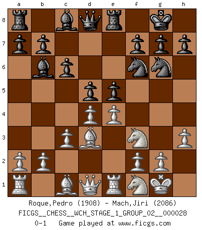 Last move : 0-1 2024 July 20 17:28:59 [Event "FICGS__CHESS__WCH_STAGE_1_GROUP_02__000028"] [Site "FICGS"] [Date "2024.03.26"] [Round "1"] [White "Roque,Pedro"] [Black "Mach,Jiri"] [Result "0-1"] [WhiteElo "1908"] [BlackElo "2086"] 1.e4 e5 2.Nf3 Nc6 3.Bb5 Nf6 4.d3 Bc5 5.c3 O-O 6.O-O d6 7.h3 Ne7 8.d4 Bb6 9.Bd3 Ng6 10.Nbd2 Re8 11.Re1 c6 12.Nf1 d5 0-1 This chess game has been lost on time (started : 2024.03.26 22:3:10) Follow this game move after move (download)Chess opens and enriches your mind. (Saudin Robovic) Zeige mir drei Eröffnungsvarianten und ich beweise dir, dass zwei davon inkorrekt sind. (Emanuel Lasker) El Ajedrez es despiadado: debes de estar preparado para matar gente. (Nigel Short) Si le désir cupide (et stupide) de gagner est une inépuisable source de souffrance, une combinaison brillante sur l'échiquier est une découverte : le coquelicot qui s'épanouit lorsque apparaît la Voie Lactée. (Arrabal) Big Chess is a place for big hallucinations. (Thibault de Vassal)