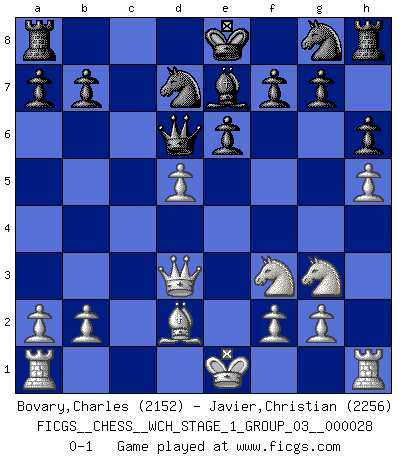 Last move : 0-1 2024 June 22 7:57:26 [Event "FICGS__CHESS__WCH_STAGE_1_GROUP_03__000028"] [Site "FICGS"] [Date "2024.03.26"] [Round "1"] [White "Bovary,Charles"] [Black "Javier,Christian"] [Result "0-1"] [WhiteElo "2152"] [BlackElo "2256"] 1.e4 c6 2.d4 d5 3.Nc3 dxe4 4.Nxe4 Bf5 5.Ng3 Bg6 6.Nf3 Nd7 7.h4 h6 8.h5 Bh7 9.Bd3 Bxd3 10.Qxd3 e6 11.Bf4 Qa5+ 12.Bd2 Bb4 13.c3 Be7 14.c4 Qc7 15.d5 cxd5 16.cxd5 Qd6 0-1 This chess game has been lost on time (started : 2024.03.26 22:3:12) Follow this game move after move (download)I won't play with you anymore. You have insulted my friend. - When an opponent cursed himself for a blunder. (Miguel Najdorf) Ich bin es gewohnt, das die Jugend mir überhaupt keinen Respekt entgegenbringt. (Alexander Morozewich) Yo no creo en la psicología. Yo creo en las buenas movidas. (Bobby Fischer) Que feriez-vous si vous étiez en train de jouer aux échecs et que la fin du monde arrive ? Je continuerais à jouer. (Saint Borromée) A clear conscience is usually the sign of a bad memory. (Unknown)