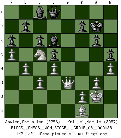 Last move : 1/2-1/2 2024 July 14 21:35:35 [Event "FICGS__CHESS__WCH_STAGE_1_GROUP_03__000028"] [Site "FICGS"] [Date "2024.03.26"] [Round "1"] [White "Javier,Christian"] [Black "Knittel,Martin"] [Result "1/2-1/2"] [WhiteElo "2256"] [BlackElo "2087"] 1.e4 e5 2.Nf3 Nc6 3.Bb5 Nf6 4.O-O Nxe4 5.Re1 Nd6 6.Nxe5 Be7 7.Bf1 Nxe5 8.Rxe5 O-O 9.d4 Bf6 10.Re1 Re8 11.Bf4 Rxe1 12.Qxe1 Ne8 13.c3 d5 14.Nd2 Nd6 15.Qe2 Bg5 16.Be5 c6 17.Re1 Bf5 18.a4 Qd7 19.Nf3 Bh6 20.Bxd6 Qxd6 21.a5 a6 22.Nd2 g6 23.Qd1 Qd7 24.b4 Re8 25.Nb3 Bf8 26.Rxe8 Qxe8 27.Qe2 Qd8 28.g3 h5 29.h4 Bd6 30.Qe3 Bc8 31.Nc5 Kg7 32.Kg2 1/2-1/2 Follow this game move after move (download)Many have become Chess Masters, no one has become the Master of Chess. (Siegbert Tarrasch) Wir können eben der zündenden Macht des Opfers nicht wiederstehen, denn die Begeisterung für das Opfer liegt in der Natur des Menschen. (Rudolf Spielmann) El Ajedrez es un juego terrible. Si no dominas el centro, tu oponente tiene una posición mas libre. Si tu tienes el centro, entonces realmente tienes algo de que preocuparte. (Siegbert Tarrasch) Demandez au pauvre Cg1 ce qu'il en pense. Eduard Gufeld à propos de la variante Saemisch de l'Est-Indienne. Life is like a game of cards: the hand you are dealt represents determinism; the way you play it is free will. (Jawaharlal Nehru)