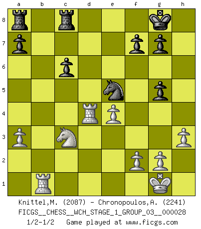Last move : 1/2-1/2 2024 May 27 21:55:7 [Event "FICGS__CHESS__WCH_STAGE_1_GROUP_03__000028"] [Site "FICGS"] [Date "2024.03.26"] [Round "1"] [White "Knittel,Martin"] [Black "Chronopoulos,Antonis"] [Result "1/2-1/2"] [WhiteElo "2087"] [BlackElo "2241"] 1.c4 e5 2.Nc3 Nf6 3.Nf3 Nc6 4.e4 Bb4 5.d3 d6 6.a3 Bc5 7.b4 Bb6 8.Be3 Bg4 9.Be2 Bxf3 10.Bxf3 Nd4 11.Na4 Nxf3+ 12.Qxf3 Bxe3 13.Qxe3 O-O 14.Nc3 Re8 15.O-O c6 16.Rac1 h6 17.h3 Nd7 18.Rb1 Qf6 19.Rfd1 Qg5 20.Qxg5 hxg5 21.d4 exd4 22.Rxd4 Ne5 23.b5 Rec8 24.bxc6 bxc6 25.Rxd6 Nxc4 26.Rd4 Ne5 1/2-1/2 Follow this game move after move (download)Chess problems demand from the composer the same virtues that characterize all worthwhile art: originality, invention, conciseness, harmony, complexity, and splendid insincerity. (Vladimir Nabokov) Jeder weiß, dass Gasprom Putins persönliches Machtinstrument ist. Die Firma wird vom Kreml aus geleitet und wird schon deshalb nie transparent sein. (Garry Kasparov) De eso se trata el Ajedrez. Un día le das una lección a tu oponente y al día siguiente el te da una a tí. (Bobby Fischer) Les Echecs ont trois composantes : le temps, l'espace et le matériel en dernier. (Mikhail Tal) Unless I accept my faults I will most certainly doubt my virtues. (Hugh Prather)