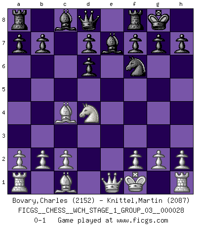 Last move : 0-1 2024 June 14 0:13:17 [Event "FICGS__CHESS__WCH_STAGE_1_GROUP_03__000028"] [Site "FICGS"] [Date "2024.03.26"] [Round "1"] [White "Bovary,Charles"] [Black "Knittel,Martin"] [Result "0-1"] [WhiteElo "2152"] [BlackElo "2087"] 1.e4 e5 2.Nf3 Nc6 3.Nc3 Nf6 4.d4 exd4 5.Nd5 Nb4 6.Bc4 Nbxd5 7.exd5 Bb4+ 8.Kf1 Bc5 9.Qe1+ Be7 10.d6 cxd6 11.Nxd4 O-O 0-1 This chess game has been lost on time (started : 2024.03.26 22:3:12) Follow this game move after move (download)Chess is everything: art, science and sport. (Anatoly Karpov) Ich war schon mal beim Dopingtest. Da musste ich Urin abgeben, während Dritte zusahen. (Elisabeth Pähtz) Creo que una cierta cantidad de temperamento es esperada de los genios del Ajedrez. (Ron Gross) Les échecs, c'est l'imagination. (David Bronstein) The existence of forgetting has never been proved: We only know that some things don't come to mind when we want them. (Friedrich Nietzsche)