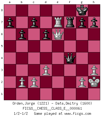 Last move : 1/2-1/2 2007 October 19 18:24:35 [Event "FICGS__CHESS__CLASS_E__000061"] [Site "FICGS"] [Date "2007.09.14"] [Round "1"] [White "Orden,Jorge"] [Black "Dats,Dmitry"] [Result "1/2-1/2"] [WhiteElo "1221"] [BlackElo "1600"] 1.e4 e5 2.Nf3 Nc6 3.Bb5 Nd4 4.Bc4 Nxf3+ 5.Qxf3 Nf6 6.Nc3 d6 7.Nd5 Be7 8.d3 O-O 9.Nxe7+ Qxe7 10.O-O Be6 11.Bxe6 Qxe6 12.Be3 Ng4 13.h3 Nxe3 14.Qxe3 b6 15.f4 exf4 16.Rxf4 f5 17.Raf1 fxe4 18.Rxe4 Rxf1+ 19.Kxf1 Rf8+ 20.Kg1 Qxa2 21.Re8 Qf7 22.Re7 Qf1+ 23.Kh2 Rf7 24.Qe6 Qf4+ 25.Kh1 Qf1+ 26.Kh2 Qf4+ 27.Kg1 Qf1+ 28.Kh2 Qf4+ 1/2-1/2 Ruy Lopez : Bird's defense Kingside Castling by player Black (move 8) Kingside Castling by player White (move 10) This chess game ended in a draw. Follow this game move after move (download)Chess, like any creative activity, can exist only through the combined efforts of those who have creative talent, and those who have the ability to organize their creative work. (Mikhail Botvinnik) Wir irren allesamt, nur jeder irrt anders. (Georg Christoph Lichtenberg) Al jugar al Ajedrez entonces, podemos aprender: Primero: Previsión... Segundo: Prudencia... Tercero: Cautela... Y al final, aprendemos del Ajedrez el hábito de no ser desanimados por apariencias malas presentes en el estado de nuestros asuntos, el hábito de la esperanza por una oportunidad favorable y la perseveración de los secretos de los recursos. (Benjamin Franklin) La guerre est enfant de la passion, la passion est enfant du narcissisme et le narcissisme est l'enfant. (...) Une autre partie ? (Thibault de Vassal) The various flowers seem good to different people. (Chinese proverb)