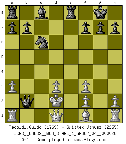 Last move : 0-1 2024 May 12 13:37:11 [Event "FICGS__CHESS__WCH_STAGE_1_GROUP_04__000028"] [Site "FICGS"] [Date "2024.03.26"] [Round "1"] [White "Tedoldi,Guido"] [Black "Swiatek,Janusz"] [Result "0-1"] [WhiteElo "1769"] [BlackElo "2255"] 1.c4 e5 2.Nc3 Nf6 3.d3 Bb4 4.Bd2 O-O 5.a3 Bxc3 6.Bxc3 Re8 7.e4 c6 8.Nf3 d5 9.cxd5 cxd5 10.Bxe5 Nc6 11.Bc3 dxe4 12.Bxf6 exf3 13.Kd2 Qxf6 14.gxf3 Qxb2+ 0-1 Follow this game move after move (download)You need not play well - just help your opponent to play badly. (Genrikh Chepukaitis) Ich habe kein Problem mit Frauen, sondern nur mit dem Niveau ihres Schachspiels (Judith Polgar) En el tablero, la mentira e hipocresía no sobreviven mucho. (Emanuel Lasker) Le profane ne songe pas à la somme de jouissance dont il se prive, qui méconnaît ce jeu aux ressources aussi variées que passionnantes. (Jean-Marie Jeanton-Lamarche) Fortune favours the audacious. (Desiderius Erasmus)