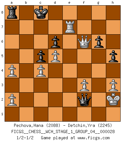 Last move : 1/2-1/2 2024 July 18 1:53:48 [Event "FICGS__CHESS__WCH_STAGE_1_GROUP_04__000028"] [Site "FICGS"] [Date "2024.03.26"] [Round "1"] [White "Pechova,Hana"] [Black "Detchin,Yra"] [Result "1/2-1/2"] [WhiteElo "2088"] [BlackElo "2245"] 1.e4 c5 2.Nf3 d6 3.d4 cxd4 4.Nxd4 Nf6 5.Nc3 a6 6.Be3 e5 7.Nb3 Be6 8.f3 h5 9.Qd2 Nbd7 10.Nd5 Bxd5 11.exd5 g6 12.Be2 Bg7 13.O-O b6 14.c4 a5 15.Rae1 O-O 16.Kh1 Nc5 17.Nxc5 bxc5 18.Bd1 Qd7 19.b3 a4 20.bxa4 e4 21.Bg5 Rfe8 22.Qf2 exf3 23.Qxf3 Ng4 24.h3 Rxe1 25.Rxe1 Ne5 26.Qf1 Qb7 27.Bb3 Qb4 28.Rd1 Qc3 29.Be7 Bf8 30.Bxf8 Kxf8 31.Qf6 Ra6 32.Qh8+ Ke7 33.Rf1 Qd2 34.Qf6+ Kd7 35.Rb1 Qd3 36.Re1 Qc3 37.Rf1 Qd2 38.Rb1 Ra8 39.Bc2 Qa5 40.Bxg6 fxg6 41.Rb7+ Kc8 42.Re7 Qe1+ 43.Kh2 Nf3+ 44.gxf3 Qf2+ 1/2-1/2 Follow this game move after move (download)There's never before been a Chess player with such a thorough knowledge of the intricacies of the game and such an absolutely indomitable will to win. I think Bobby is the greatest player that ever lived. (Lisa Lane) Ich habe Kasparov in Rente geschickt. (Veselin Topalov) Vive, pierde y aprende al observar a tu oponente como gana. (Amber Steenbock) Psychologiquement, tu dois avoir confiance en toi même, mais cette confiance doit être basée sur des faits. (Robert Fischer) Faith : not wanting to know what is true. (Friedrich Nietzsche)