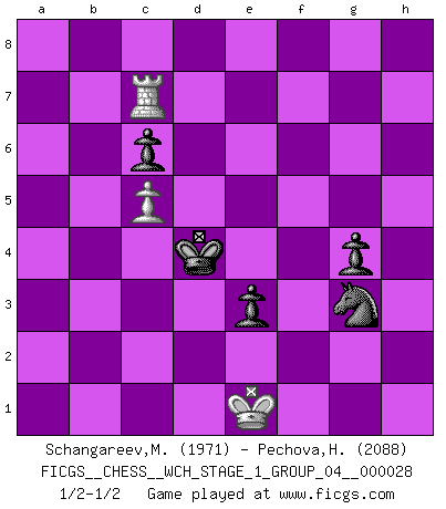 Last move : 1/2-1/2 2024 July 22 1:27:8 [Event "FICGS__CHESS__WCH_STAGE_1_GROUP_04__000028"] [Site "FICGS"] [Date "2024.03.26"] [Round "1"] [White "Schangareev,Mirzian"] [Black "Pechova,Hana"] [Result "1/2-1/2"] [WhiteElo "1971"] [BlackElo "2088"] 1.e4 e5 2.Nf3 Nc6 3.d4 exd4 4.Nxd4 Nf6 5.Nc3 Bb4 6.Nxc6 bxc6 7.Bd3 d5 8.a3 Bxc3+ 9.bxc3 dxe4 10.Be2 Qxd1+ 11.Kxd1 Bg4 12.Bxg4 Nxg4 13.Ke2 O-O-O 14.Rb1 Nf6 15.c4 Nd7 16.Be3 Nb6 17.c5 Nc4 18.Rb4 Nxa3 19.Rc1 Nb5 20.Ra1 Rhe8 21.Kf1 Nc3 22.Bd4 Nd5 23.Rba4 f6 24.Rxa7 Kd7 25.Re1 Rb8 26.g3 Rb4 27.c3 Rc4 28.Ra3 f5 29.h4 g6 30.f3 h6 31.fxe4 fxe4 32.Re2 g5 33.hxg5 hxg5 34.Kg2 Re6 35.Kh3 e3 36.Kg2 g4 37.Kf1 Re4 38.Re1 Ke6 39.Ke2 Rexd4 40.cxd4 Rxd4 41.Ra8 Rd2+ 42.Kf1 Ke5 43.Ra4 Rd4 44.Rxd4 Kxd4 45.Ra1 Nc3 46.Ra7 Ne4 47.Ke1 Nxg3 48.Rxc7 1/2-1/2 Follow this game move after move (download)Who is your opponent tonight, tonight I am playing against the Black pieces. (Akiba Rubinstein) Der Partner hat auch seine Existenzberechtigung. (Savielly Grigorievitsch Tartakower) Alguna parte de un error es siempre correcto. (Savielly Tartakover) Avec des compensations pour le matériel en plus... (Anonyme) We need strong personalities and only one world champion to attract sponsors. (Anatoly Karpov)