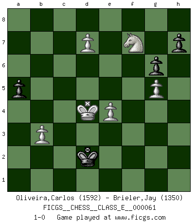 Last move : 1-0 2007 December 1 23:31:35 [Event "FICGS__CHESS__CLASS_E__000061"] [Site "FICGS"] [Date "2007.09.14"] [Round "1"] [White "Oliveira,Carlos"] [Black "Brieler,Jay"] [Result "1-0"] [WhiteElo "1592"] [BlackElo "1350"] 1.d4 Nf6 2.c4 g6 3.Nc3 Bg7 4.e4 d6 5.f3 O-O 6.Be3 c5 7.d5 e6 8.Qd2 exd5 9.cxd5 b6 10.Bh6 Bxh6 11.Qxh6 Ba6 12.O-O-O Nbd7 13.Bxa6 Ne5 14.Nge2 Rb8 15.h3 b5 16.Bxb5 Qb6 17.b3 Rfc8 18.Qe3 a6 19.Ba4 c4 20.Qxb6 Rxb6 21.bxc4 Rxc4 22.Bb3 Rc5 23.Kd2 Nc4+ 24.Bxc4 Rxc4 25.Rb1 Rxb1 26.Rxb1 Nd7 27.Rb7 Nc5 28.Rb8+ Kg7 29.Nc1 Kf6 30.Nd3 Rd4 31.e5+ dxe5 32.Rb6+ Kf5 33.g4+ Kg5 34.Ne4+ Nxe4+ 35.fxe4 a5 36.Ke3 Kh4 37.Nxe5 Ra4 38.Rb2 Kxh3 39.g5 Ra3+ 40.Kd4 Kg3 41.Rb3+ Rxb3 42.axb3 Kf2 43.Nxf7 Ke2 44.d6 Kd2 45.d7 1-0 King's Indian : Saemisch, 5...O-O Kingside Castling by player Black (move 5) Queenside Castling by player White (move 12) 10 pieces endgame at move 43 : White KNPPPP , Black KPPP WHITE : King + 1 Knight 4 Pawns BLACK : King + 3 Pawns Player White won this chess game. Follow this game move after move (download)Nowadays, when you're not a grandmaster at 14, you can forget about it. (Anand Viswanathan) Mein erstes Ziel war nicht, die Partie zu gewinnen, sondern eine Figur zu opfern. -- der junge (Wilhelm Steinitz) No solamente yo pronostico su triunfo sobre Botvinnik, sino que me adelanto y digo que probablemente Fischer es el jugador de Ajedrez mas grande que haya existido. (John Collins) Ne tendez aucun piège pour le plaisir ! Ne jouez rien dans l'espoir que l'adversaire réagisse de façon stupide ! Prenez toujours pour acquis que l'adversaire va trouver le meilleur coup ! Ne jouez jamais de coup dans l'espoir que l'adversaire ne voie pas la menace ! Chacun de vos coups doit améliorer la position d'une façon ou d'une autre. Whenever people agree with me, I always feel I must be wrong. (Oscar Wilde)