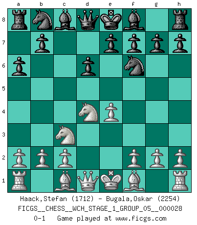 Last move : 0-1 2024 May 24 22:42:25 [Event "FICGS__CHESS__WCH_STAGE_1_GROUP_05__000028"] [Site "FICGS"] [Date "2024.03.26"] [Round "1"] [White "Haack,Stefan"] [Black "Bugala,Oskar"] [Result "0-1"] [WhiteElo "1712"] [BlackElo "2254"] 1.e4 c5 2.Nf3 d6 3.d4 cxd4 4.Nxd4 Nf6 5.Nc3 a6 0-1 This chess game has been lost on time (started : 2024.03.26 22:3:15) Follow this game move after move (download)Nowadays, when you're not a grandmaster at 14, you can forget about it. (Anand Viswanathan) Es war undenkbar für die Behörden, dass ein sowjetischer Großmeister auf diese Art und Weise [Fischer-Taimanov 6:0] verliert, ohne dass es eine politischer Erklärung dafür gäbe. (Mark Taimanov) Yo siempre he tenido un ligero sentimiento de lástima por una persona que no tiene conocimiento del Ajedrez. (Siegbert Tarrasch) Même un GMI sait rarement calculer sur plus de cinq coups une attaque à sacrifices. (Rudolf Spielmann) Luck never made a man wise. (Seneca, Letters to Lucilius)
