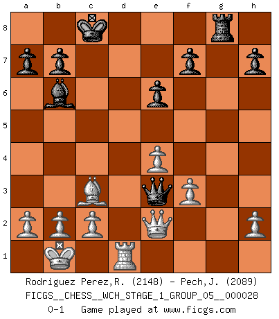 Last move : 0-1 2024 July 20 8:55:1 [Event "FICGS__CHESS__WCH_STAGE_1_GROUP_05__000028"] [Site "FICGS"] [Date "2024.03.26"] [Round "1"] [White "Rodriguez Perez,Rene"] [Black "Pech,Jaroslav senior"] [Result "0-1"] [WhiteElo "2148"] [BlackElo "2089"] 1.e4 d5 2.exd5 Qxd5 3.Nc3 Qa5 4.d4 Nf6 5.Nf3 Bf5 6.Bc4 e6 7.Bd2 c6 8.Nd5 Qd8 9.Nxf6+ Qxf6 10.Qe2 Nd7 11.O-O-O Bg4 12.d5 Bxf3 13.gxf3 cxd5 14.Bxd5 O-O-O 15.Be4 Nc5 16.Bc3 Rxd1+ 17.Rxd1 Qf4+ 18.Kb1 Nxe4 19.fxe4 Bc5 20.f3 Bb6 21.Bxg7 Rg8 22.Bc3 Qe3 0-1 Follow this game move after move (download)The laws of Chess do not permit a free choice: you have to move whether you like it or not. (Emanuel Lasker) Die Fehler sind da, Sie warten nur darauf gemacht zu werden. (Savielly Grigorievitsch Tartakower) Yo he agregado estos principios a la ley: pongan los Caballos en acción antes de que los dos Alfiles sean desarrollados. (Emanuel Lasker) Les Echecs ne sont pas pour les âmes timides. Ils requièrent un homme entier, qui ne s'arrête pas aveuglément à ce qui a été déjà établi, mais qui tente individuellement de sonder les profondeurs du jeu. (W. Steinitz) Life is painting a picture, not doing a sum. (Oliver Wendell Holmes, Jr.)