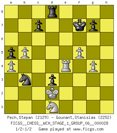 Last move : 1/2-1/2 2024 June 22 20:32:4 [Event "FICGS__CHESS__WCH_STAGE_1_GROUP_06__000028"] [Site "FICGS"] [Date "2024.03.26"] [Round "1"] [White "Pech,Stepan"] [Black "Gounant,Stanislas"] [Result "1/2-1/2"] [WhiteElo "2129"] [BlackElo "2252"] 1.d4 e6 2.c4 b6 3.e4 Bb4+ 4.Bd2 Bxd2+ 5.Qxd2 d5 6.Bd3 Nc6 7.Nf3 dxe4 8.Bxe4 Bb7 9.Nc3 Nf6 10.Bc2 O-O 11.O-O-O a6 12.Rhe1 Nb4 13.Bb1 b5 14.d5 bxc4 15.dxe6 Qxd2+ 16.Rxd2 fxe6 17.Ng5 Rfe8 18.g3 Rab8 19.f4 h6 20.Nxe6 Bc8 21.f5 Kf7 22.Rd8 Rxd8 23.Nxd8+ Kf8 24.a3 Nd3+ 25.Bxd3 cxd3 26.Ne6+ Kf7 27.b4 a5 28.b5 Bxe6 29.Rxe6 Rd8 30.Kd2 Ng4 31.h3 Nh2 32.g4 h5 33.Re4 hxg4 34.hxg4 Nf3+ 35.Ke3 Ne1 36.Kd2 Nc2 37.a4 Nd4 38.Nd1 Nb3+ 39.Kc3 Nc1 40.Kd2 Nb3+ 1/2-1/2 Follow this game move after move (download)Chess demands total concentration. (Bobby Fischer) Schach ist eine Sache der genauen Beurteilung, wann man zuschlagen und wann man sich ducken muss. (Robert James Fischer) ¿Esta Bobby Fischer algo cuerdo?. (Salo Flohr) Toutes les manuvres exécutées sur une colonne ouverte ont pour but ultime l'intrusion définitive sur la septième ou la huitième rangée, en plein cur de la position ennemie. (Aaron Nimzovitch) How many people work in NATO Headquarters ? - About half of them. (Dirk Stikker, NATO general secretary)