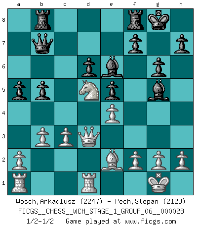 Last move : 1/2-1/2 2024 June 6 2:41:6 [Event "FICGS__CHESS__WCH_STAGE_1_GROUP_06__000028"] [Site "FICGS"] [Date "2024.03.26"] [Round "1"] [White "Wosch,Arkadiusz"] [Black "Pech,Stepan"] [Result "1/2-1/2"] [WhiteElo "2247"] [BlackElo "2129"] 1.e4 c5 2.Nf3 Nc6 3.d4 cxd4 4.Nxd4 Nf6 5.Nc3 e5 6.Ndb5 d6 7.Bg5 a6 8.Na3 b5 9.Nd5 Be7 10.Bxf6 Bxf6 11.c3 Bg5 12.Nc2 Rb8 13.Be2 O-O 14.O-O Be6 15.Qd3 g6 16.Ndb4 Nxb4 17.Nxb4 Qb6 18.Rfd1 a5 19.Nd5 Qb7 20.b3 1/2-1/2 Follow this game move after move (download)Chess is a cold bath for the mind. (Sir John Simon) Ein Isolani verdüstert die Stimmung auf dem ganzen Schachbrett. (Savielly Grigorievitsch Tartakower) La maestría del Ajedrez consiste esencialmente en analizar posiciónes de Ajedrez con precisión. (Mikhail Botvinnik) Dans le domaine de la peinture, de la gravure et de la sculpture, dès la première décennie de notre siècle, les artistes abandonnent la représentation de la partie d'échecs pour se concentrer sur les pièces, sur les échiquiers et sur toutes les variations auxquelles les unes et les autres peuvent donner lieu. On passe en quelque sorte d'un thème social à un thème musical (au sens de la musica médiévale, c'est-à-dire d'une notion qui inclue le rythme, l'harmonie, la construction et la déconstruction, etc.). Graphiquement et picturalement, l'échiquier apparaît comme une structure ouverte, dynamique, d'une richesse infinie, autorisant toutes les combinatoires et débouchant sur des mouvements et des rythmes de nature exponentielle. (Michel Pastoureau) Quotation,n.: The act of repeating erroneously the words of another. The words erroneously repeated. (Ambrose Bierce, The Devil's Dictionary)