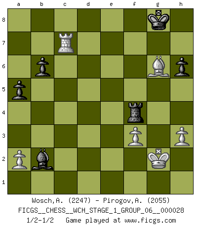 Last move : 1/2-1/2 2024 June 2 10:22:6 [Event "FICGS__CHESS__WCH_STAGE_1_GROUP_06__000028"] [Site "FICGS"] [Date "2024.03.26"] [Round "1"] [White "Wosch,Arkadiusz"] [Black "Pirogov,Andrey Mikhaylovich"] [Result "1/2-1/2"] [WhiteElo "2247"] [BlackElo "2055"] 1.e4 e5 2.Nf3 Nc6 3.Bc4 Bc5 4.c3 Nf6 5.d3 O-O 6.O-O d6 7.Re1 a5 8.h3 h6 9.Bb5 Ba7 10.Nbd2 Ne7 11.d4 Ng6 12.Nf1 exd4 13.cxd4 d5 14.e5 Ne4 15.Ng3 f5 16.exf6 Qxf6 17.Nxe4 dxe4 18.Rxe4 Bxh3 19.gxh3 Qxf3 20.Qxf3 Rxf3 21.Kg2 Raf8 22.Bc4+ Kh8 23.Be3 R3f5 24.Re1 Nf4+ 25.Bxf4 Rxf4 26.Rxf4 Rxf4 27.Re8+ Kh7 28.Bd3+ g6 29.Re7+ Kg8 30.Rxc7 Bxd4 31.f3 b6 32.Bxg6 Bxb2 1/2-1/2 Follow this game move after move (download)Fischer, who may or may not be mad as a hatter, has every right to be horrified. (Jeremy Silman) Ich spiele ehrlich und spiele, um zu gewinnen. Wenn ich verliere nehme ich meine Medizin. (Robert James Fischer) Fischer deseaba darle a los Rusos una sopa de su propia medicina. (Larry Evans) Nous sommes les pions de la mystérieuse partie d'Echecs jouée par Dieu. Il nous déplace, nous arrête, nous pousse encore, puis nous lance un à un dans la boîte du Néant. Epitaphe sur la tombe de David Janowsky (1868-1927). Hello Thibault, if I have had a plan (and I had one, I hope), I have forgotten it during the last week... - Hello Heinz-Georg. What do you mean a plan ? (Anonymous players, during a Big Chess game)