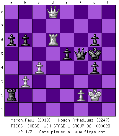 Last move : 1/2-1/2 2024 May 24 17:42:16 [Event "FICGS__CHESS__WCH_STAGE_1_GROUP_06__000028"] [Site "FICGS"] [Date "2024.03.26"] [Round "1"] [White "Maron,Paul"] [Black "Wosch,Arkadiusz"] [Result "1/2-1/2"] [WhiteElo "2018"] [BlackElo "2247"] 1.d4 Nf6 2.Nf3 d5 3.e3 c5 4.c3 e6 5.Bd3 Nbd7 6.O-O b6 7.Nbd2 Bb7 8.Re1 a6 9.Qc2 Rc8 10.b3 Bd6 11.c4 O-O 12.e4 dxe4 13.Bxe4 Nxe4 14.Nxe4 Be7 15.dxc5 Nxc5 16.Nxc5 Rxc5 17.Ba3 Ra5 18.Bxe7 Qxe7 19.Qe2 h6 20.Ne5 Rd8 21.Red1 Rxd1+ 22.Rxd1 Bxg2 23.Kxg2 Qg5+ 24.Ng4 h5 25.h3 hxg4 26.hxg4 Rxa2 27.Qf3 f5 28.Rd6 fxg4 29.Qe4 e5 30.Qa8+ Kh7 31.Qe4+ g6 32.Qb7+ Kh6 33.Qb8 Qf5 34.Qh8+ Kg5 35.Qd8+ Kh5 36.Qh8+ Kg5 37.Qd8+ 1/2-1/2 Follow this game move after move (download)One of these modest little moves may be more embarrassing to your opponent than the biggest threat. (Siegbert Tarrasch) Wie ich sie so einen nach dem anderen nieder mähte wurde meine Überlegenheit offensichtlich. (José Raúl Capablanca) Cuando le juegas a Fischer, no es una cuestion de si vas a ganar o perder. Es una cuestion de si vas a sobrevivir. (Boris Spassky) Je crois qu'il existe des manières très spécifiques de jouer efficacement contre une machine. Evidemment, nous n'avons aucune chance en technique pure, parce que l'ordinateur calcule de manière parfaite. Mais lorsque nous faisons appel à notre cerveau, en utilisant l'intuition et la compréhension, alors nous restons beaucoup plus forts. (Anatoli Karpov) He who laughs last probably does not get the joke. (Unknown)