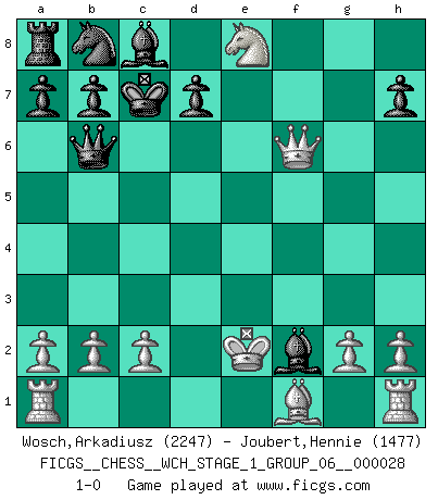 Last move : 1-0 2024 April 26 20:6:55 [Event "FICGS__CHESS__WCH_STAGE_1_GROUP_06__000028"] [Site "FICGS"] [Date "2024.03.26"] [Round "1"] [White "Wosch,Arkadiusz"] [Black "Joubert,Hennie"] [Result "1-0"] [WhiteElo "2247"] [BlackElo "1477"] 1.e4 c5 2.Nf3 e6 3.d4 cxd4 4.Nxd4 Nf6 5.Nc3 Qb6 6.e5 Bc5 7.Ndb5 Bxf2+ 8.Ke2 Nd5 9.Nd6+ Ke7 10.Nxd5+ exd5 11.Qxd5 Rf8 12.Bg5+ f6 13.exf6+ gxf6 14.Qe5+ Kd8 15.Bxf6+ Rxf6 16.Qxf6+ Kc7 17.Ne8+ 1-0 Follow this game move after move (download)Even the laziest King flees wildly in the face of a double check ! (Aaron Nimzowitsch) Was ist der Unterschied zwischen einem Strassenarbeiter und einem Schachspieler? --Der Schachspieler bewegt sich ab und zu. (Anonymous) El Jaque al descubierto es el bombardero del tablero. (Reuben Fine) Ce n'est pas pour s'amuser qu'il joue aux échecs : il célèbre un culte. (Vladimir Nabokov) Life is like a play: it's not the length but the excellence of the acting that matters. (Seneca)